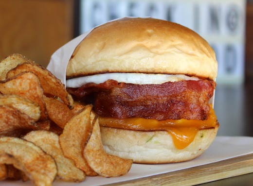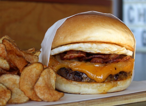 1 Huevo, carne de res, tocino ahumado, queso cheddar y cebollas asadas. Con pan tipo brioche y huevos estrellados. Incluye papas corte chips.