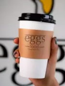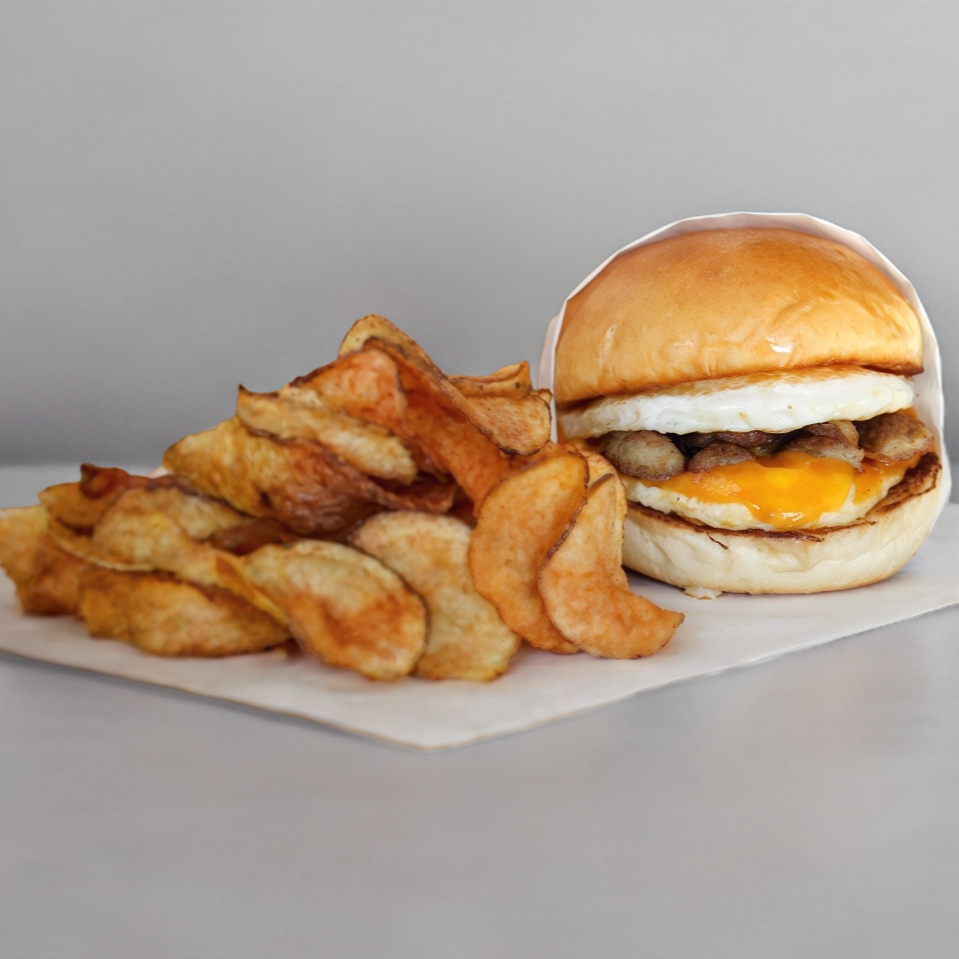 2 Huevos, salchicha de cerdo y queso cheddar. Con pan tipo brioche y huevos estrellados. Incluye papas corte chips.