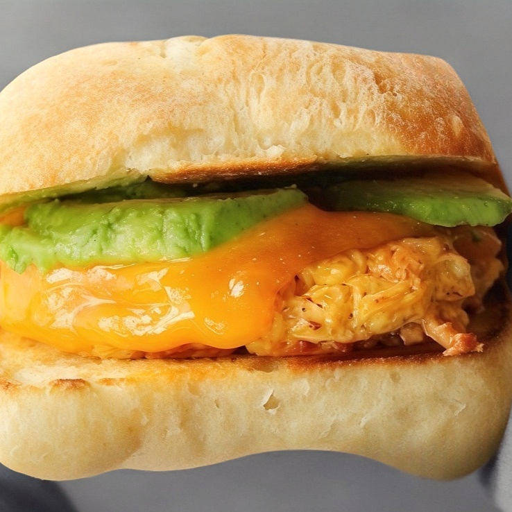 2 Huevos revueltos, aguacate, tocino ahumado y queso cheddar. Con aderezo de miel mostaza. Con pan tipo ciabatta. Incluye papas corte chips.