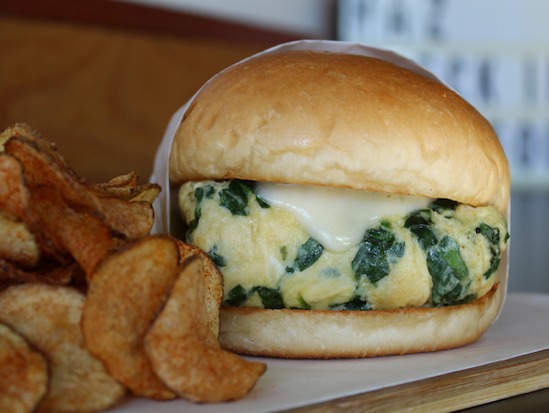 2 Huevos, espinaca y queso monterrey, preparado en omelette. Con pan brioche. Incluye papas corte chips. (Porción personal)