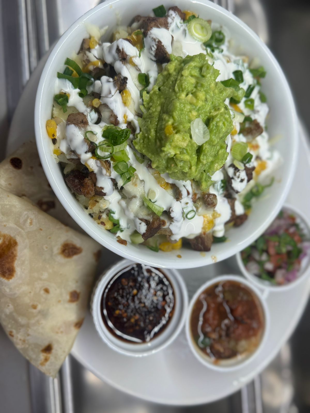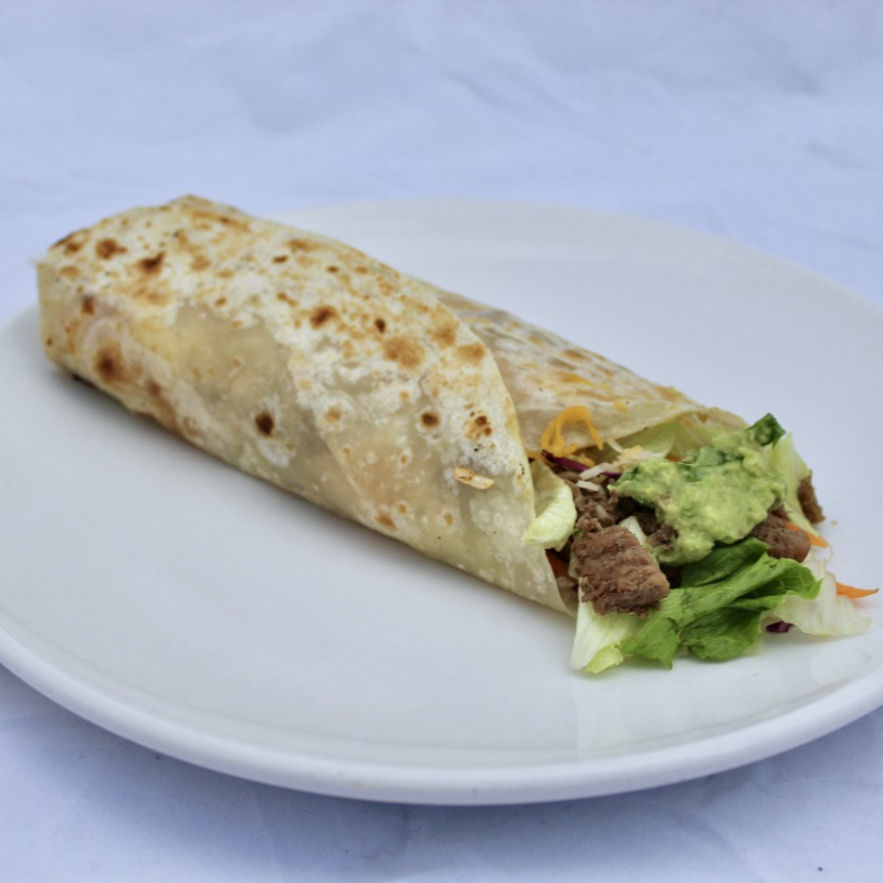 Con frijol, queso, arroz, lechuga, salsa, crema, guacamole, cilantro, cebolla y un guisado de tu elección.