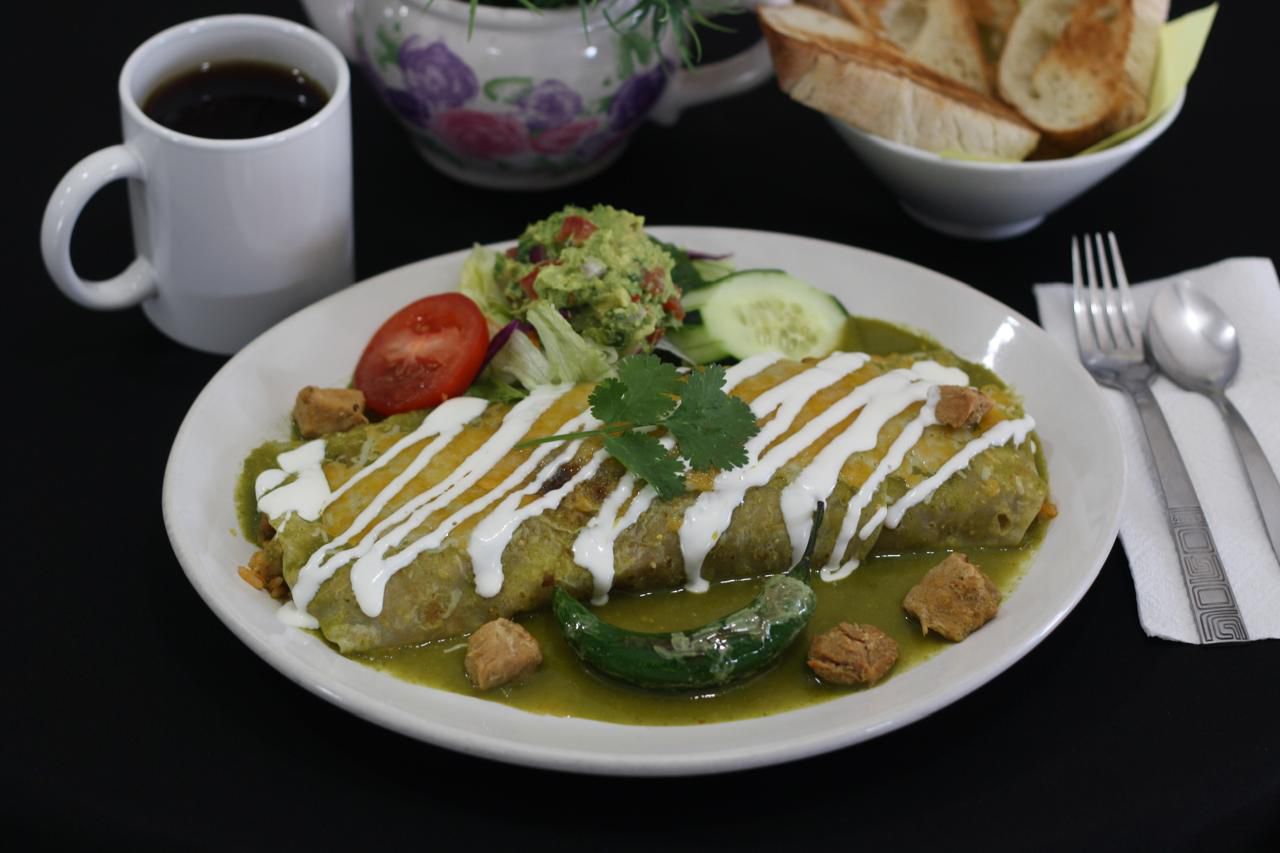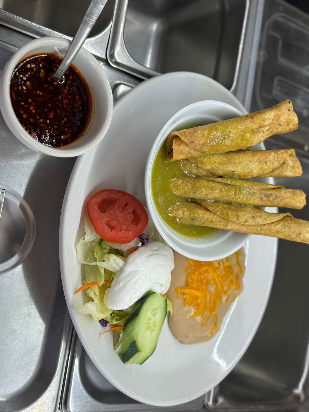 Ricas flautas mojadas en salsa verde, de pollo o carne deshebrada, acompañadas de frijoles queso jack cheddar y crema.