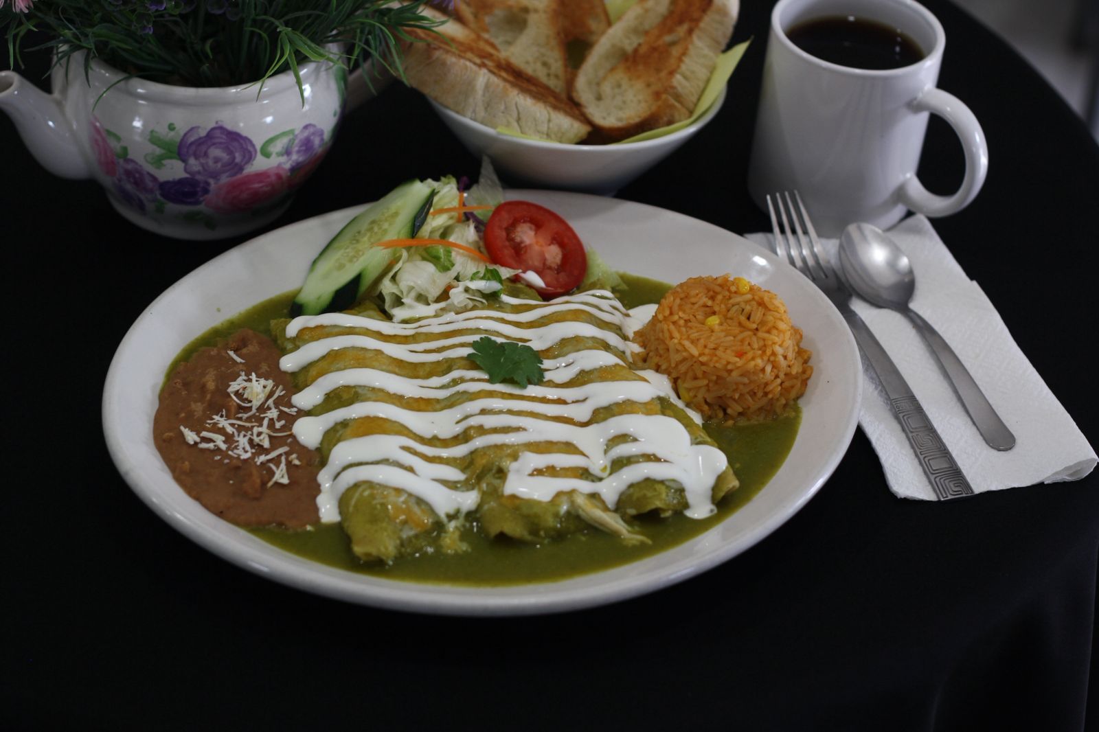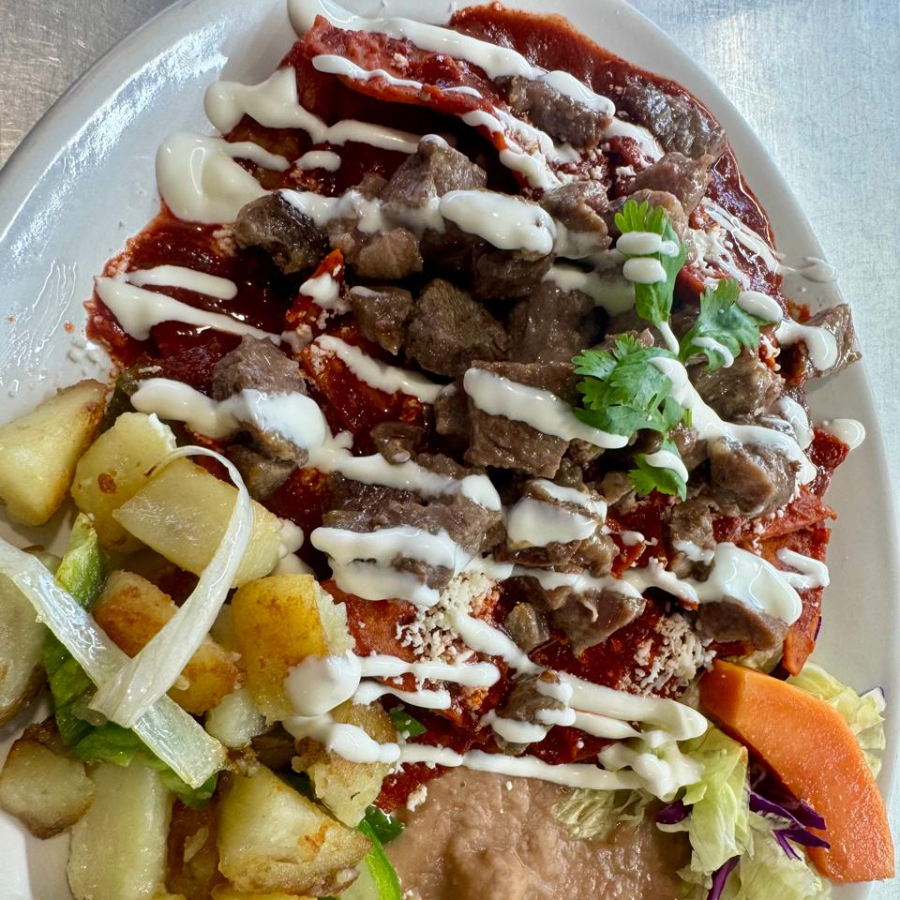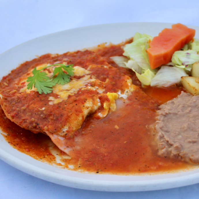 De pollo, carne deshebrada o puerco en salsa verde, bañadas en salsa verde o roja, queso gratinado y crema, acompañadas de arroz y frijoles.