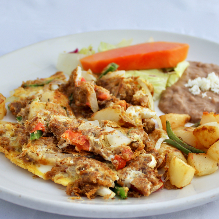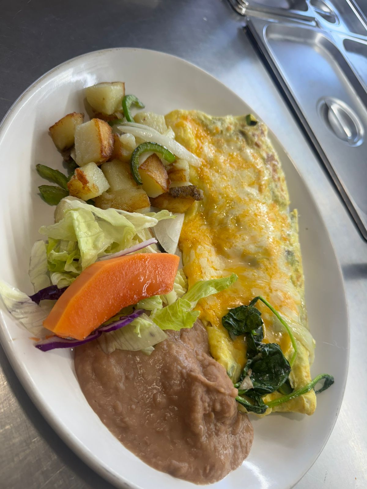 De 3 huevos, a elegir jamón, chorizo o espinacas y champiñones, acompañado de frijoles y papa.