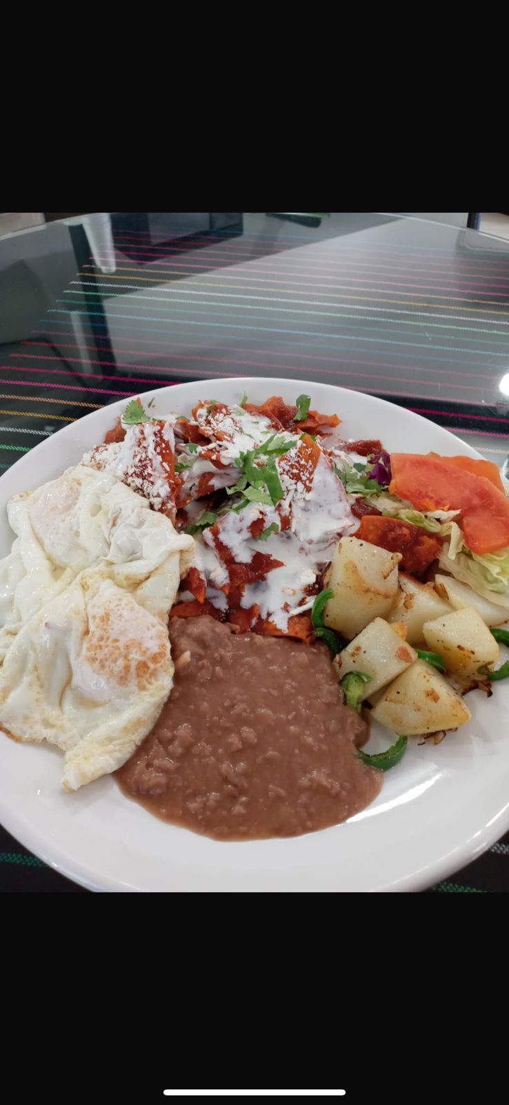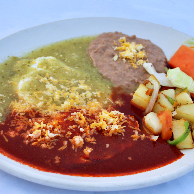 Jamón, tortilla frita con huevos al gusto, bañados en salsa verde, roja o ranchera, acompañados de frijoles y papa.