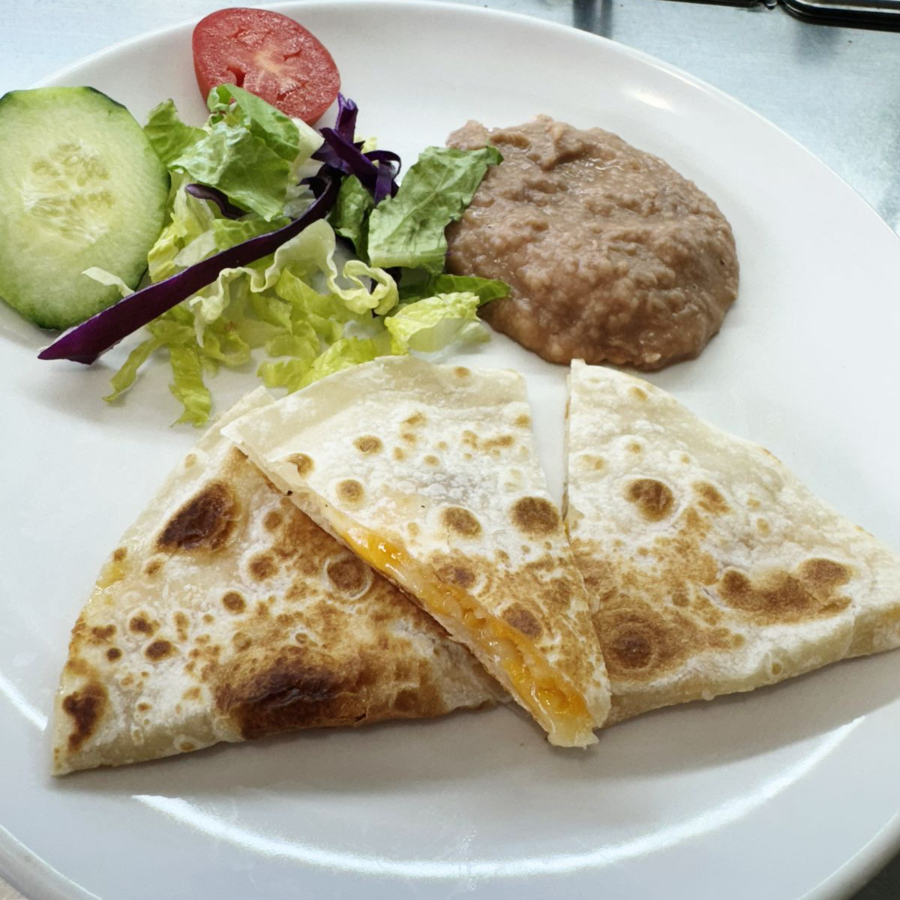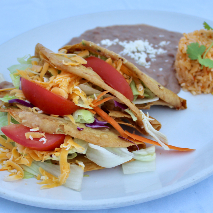 3 Tacos de carne deshebrada o pollo, con lechuga, tomate, queso Jack Cheddar. Servidas con arroz y frijoles.