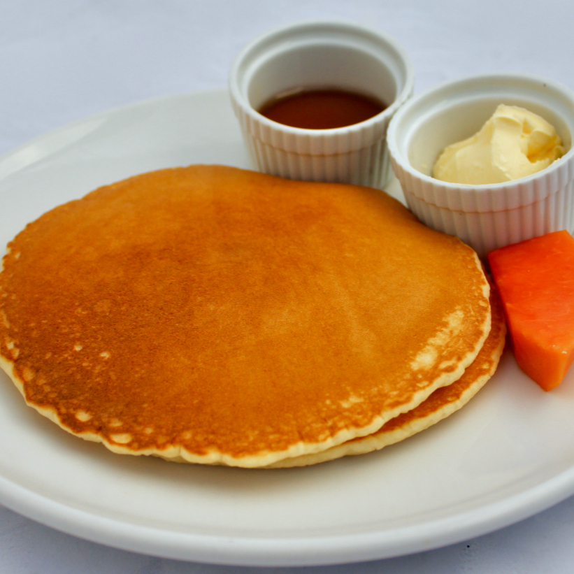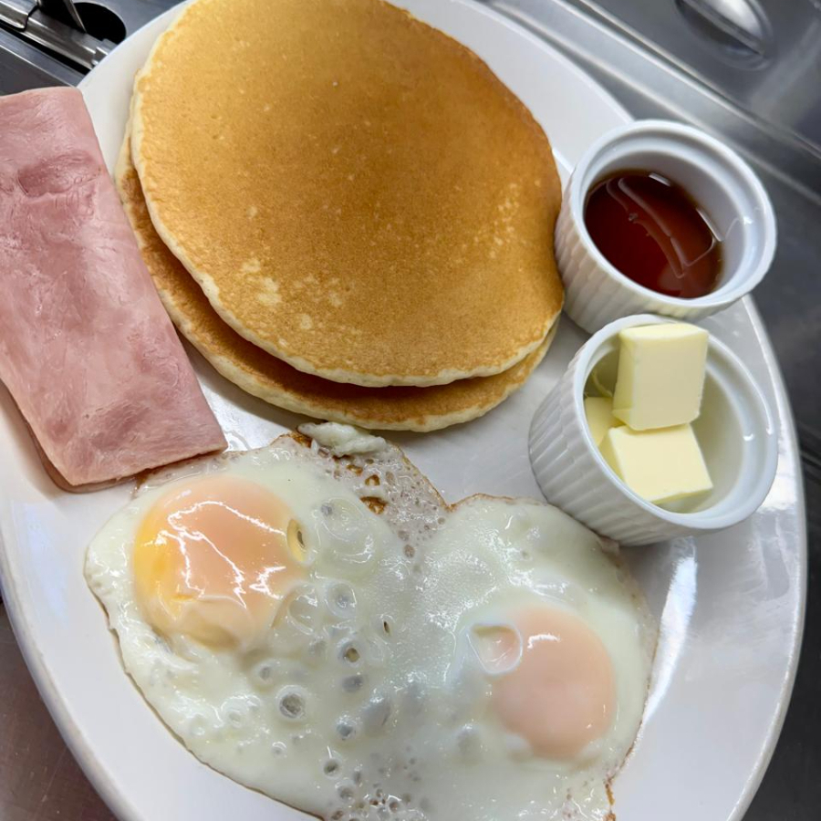 Desayuno completo y balanceado que incluye dos suaves y esponjosos hot cakes servidos con mantequilla y miel, acompañados de huevos al gusto y rebanadas de jamón doradas a la plancha. Una combinación ideal de sabores dulces y salados que brinda energía y satisfacción en cada bocado.