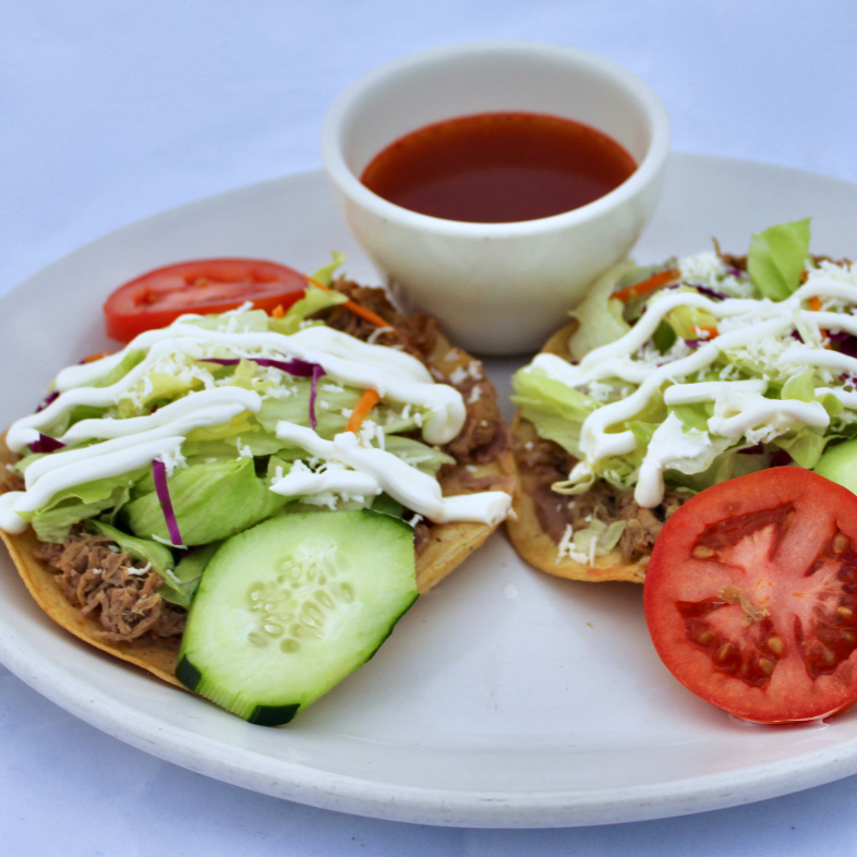 2 Tostadas de carne deshebrada o pollo, lechuga, tomate, queso y crema.