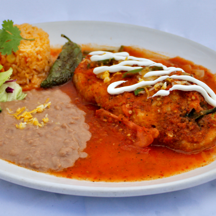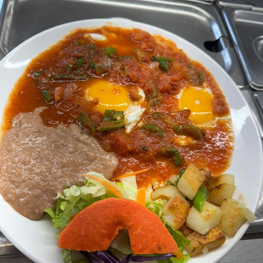 Bañado en rica salsa ranchera y acompañado de arroz, frijoles, tortillas.