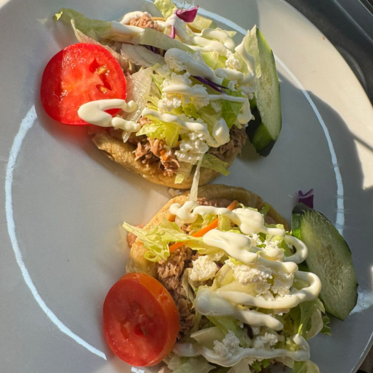 2 Sopes de carne deshebrada o pollo, lechuga, tomate, queso y crema.