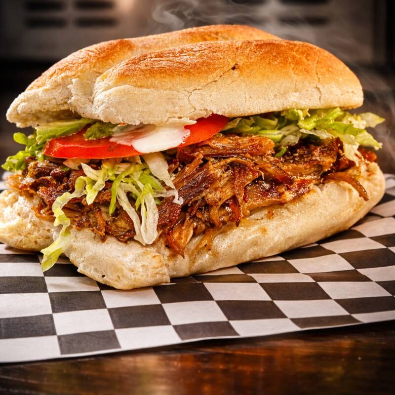 Pan de telera doradita, lomo de cerdo horneado jugoso y bien servido, lechuga fresca, tomate, aguacate cremoso.
