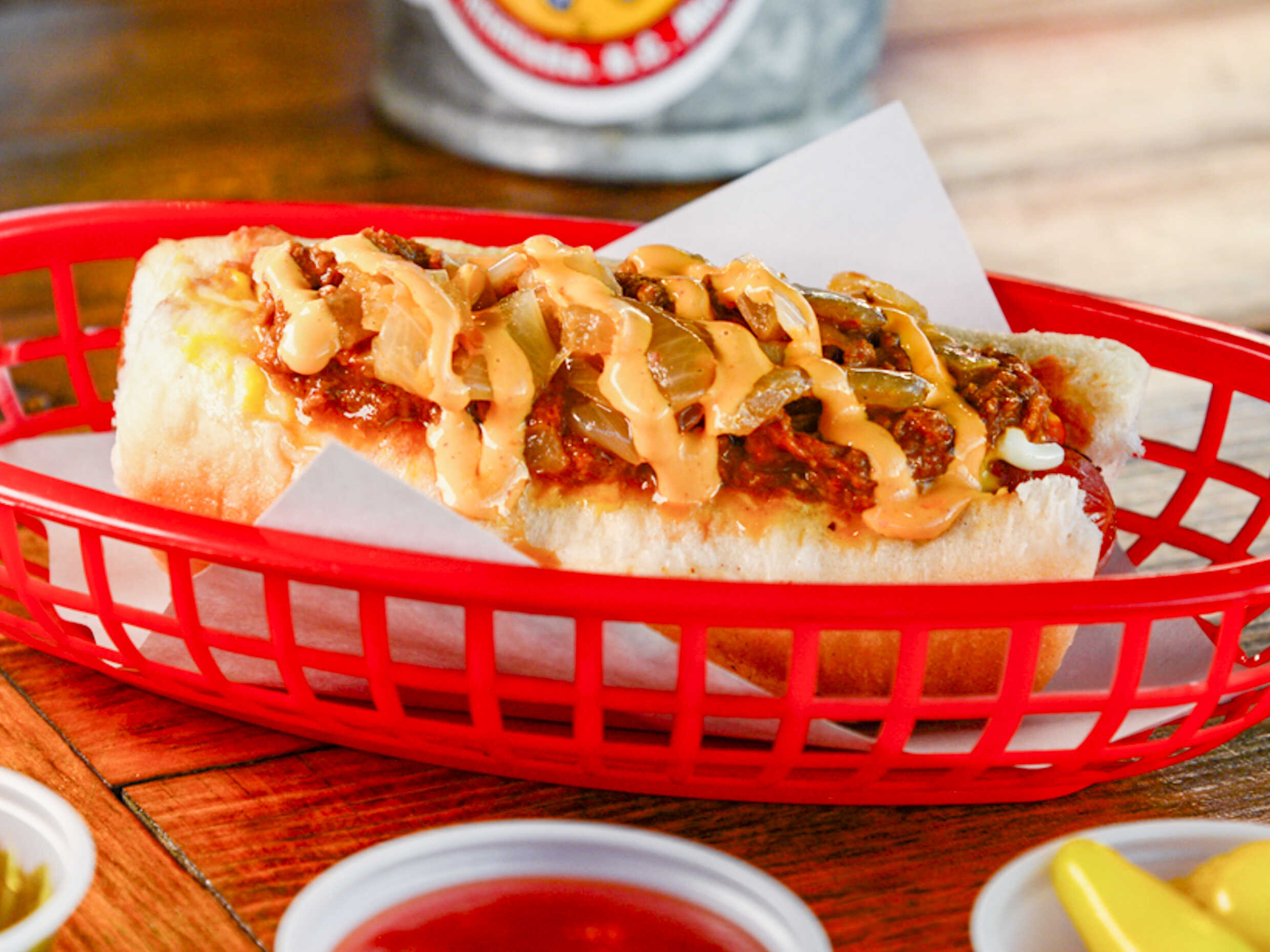 Salchicha envuelta en tocino, queso de nachos, frijol con chorizo, cebolla asada y carne deshebrada.