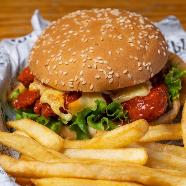 carne, tocino, aros de cebolla, queso amarillo, aderezo bbq y verduras.