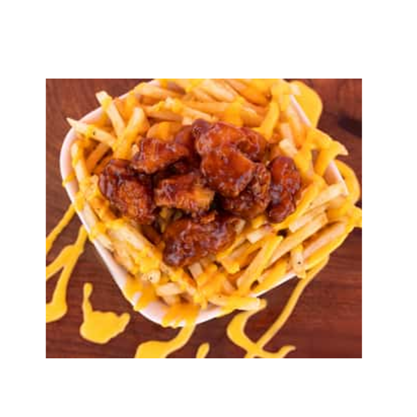 Cama de papas con media orden de boneless bañadas en salsa de tu prefrencia, cubiertas de queso amarillo por encima tocino y aderezo ranch y chipotle de la casa.