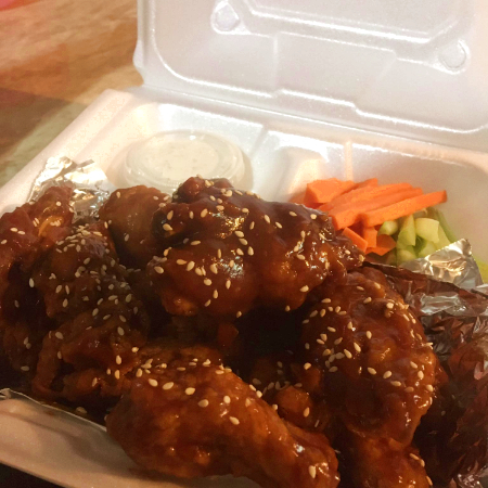 Alitas bañadas en salsa de tu preferencia acompañada de aderezo ranch de la casa y zanahoria.
