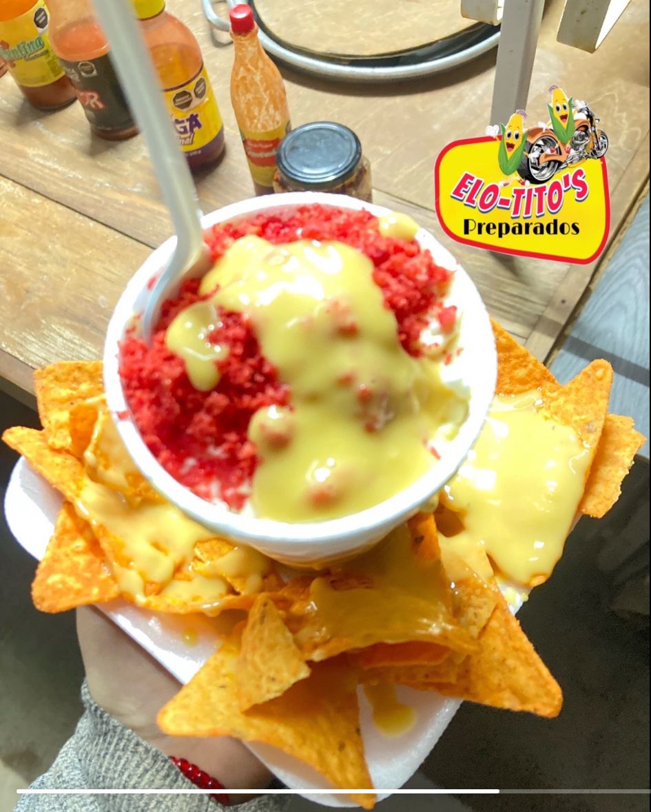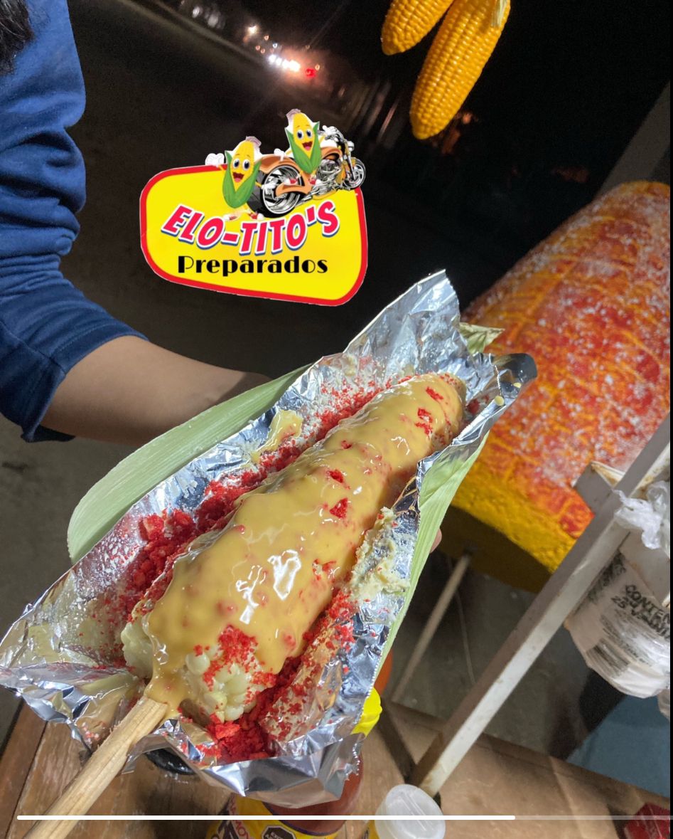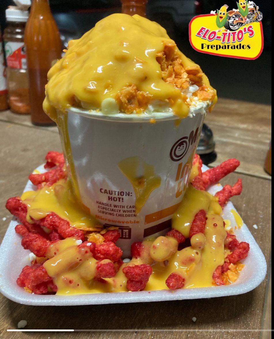 Elote entero con: mantequilla, mayonesa ,queso, limón.Bañado de topping de Sabritas y cubierto de queso amarillo