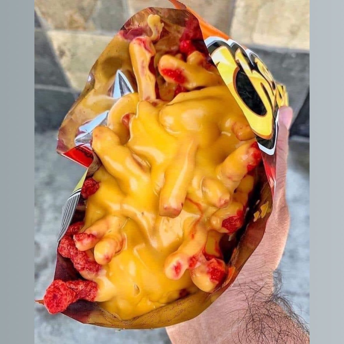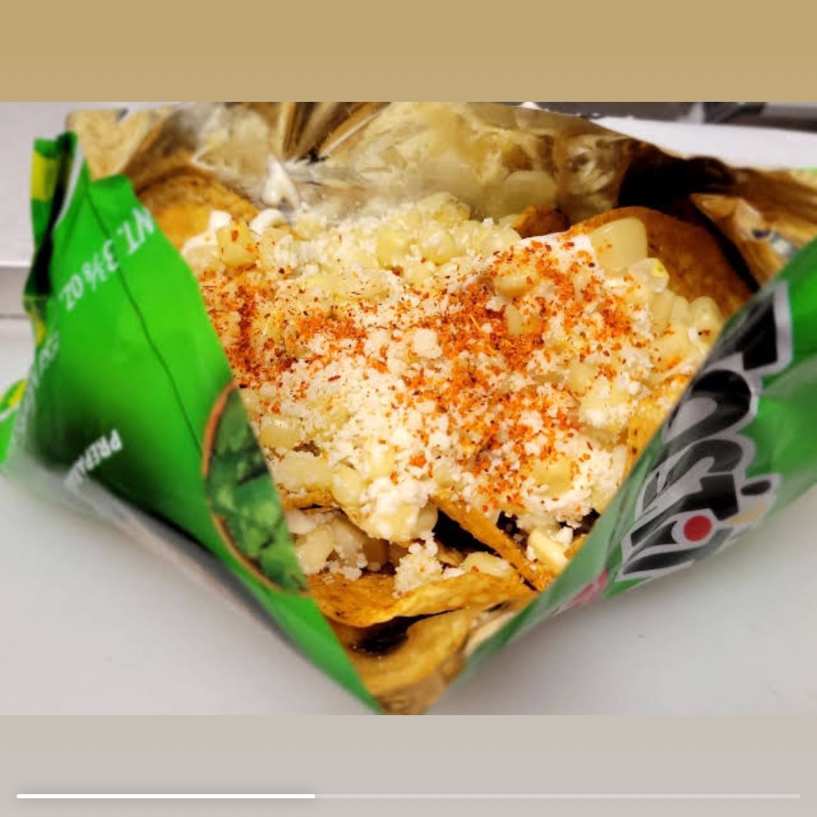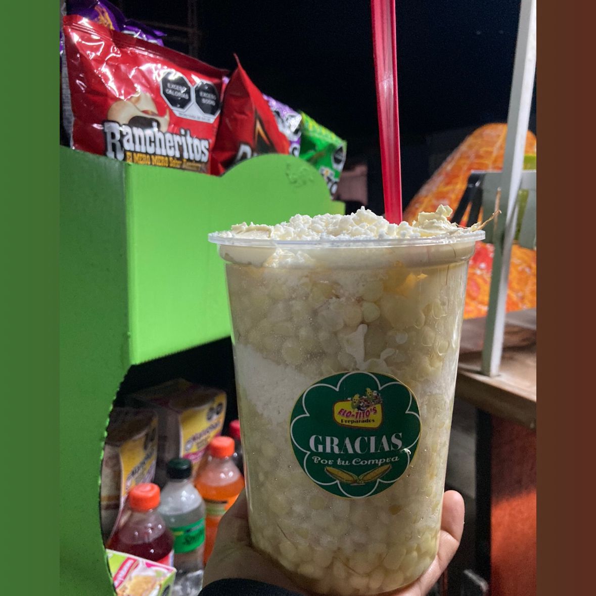 Elote entero con: mantequilla, mayonesa ,queso, limón.Bañado de topping de Sabritas y cubierto de queso amarillo