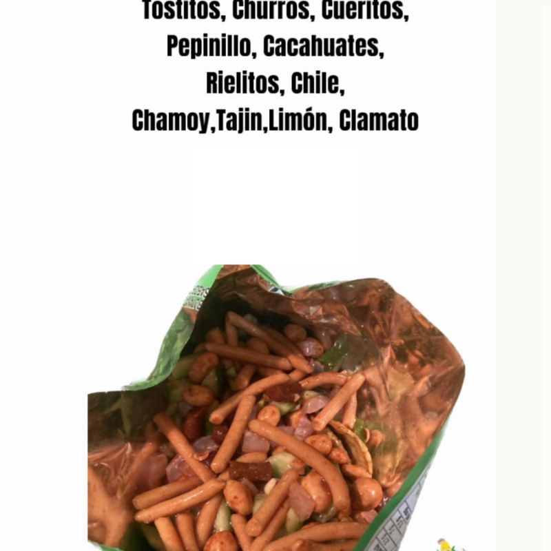 Sabritas con : churros, cueritos, pepino, cacahuate, rielitos,chamoy, Tajín,chile, limón,clamato