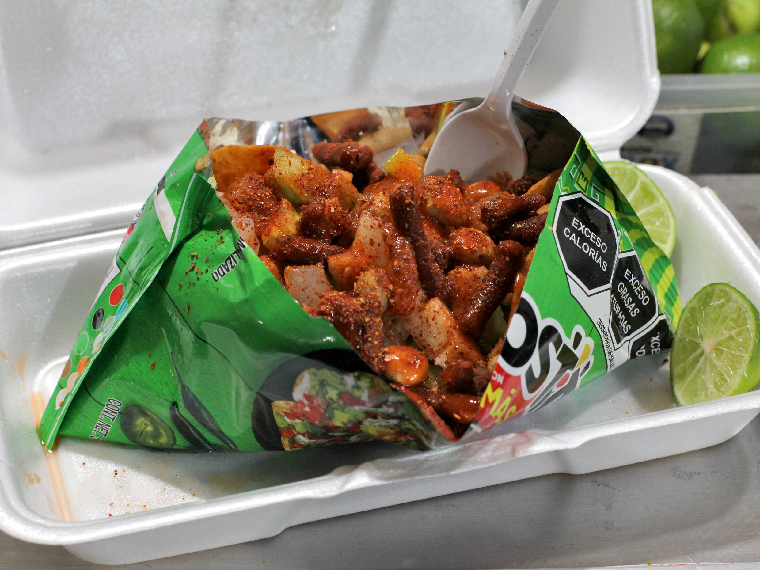 Doritos a escojer con pepino, rielitos, cuerito, cacahuate, clamato, sal, limón, salsa.