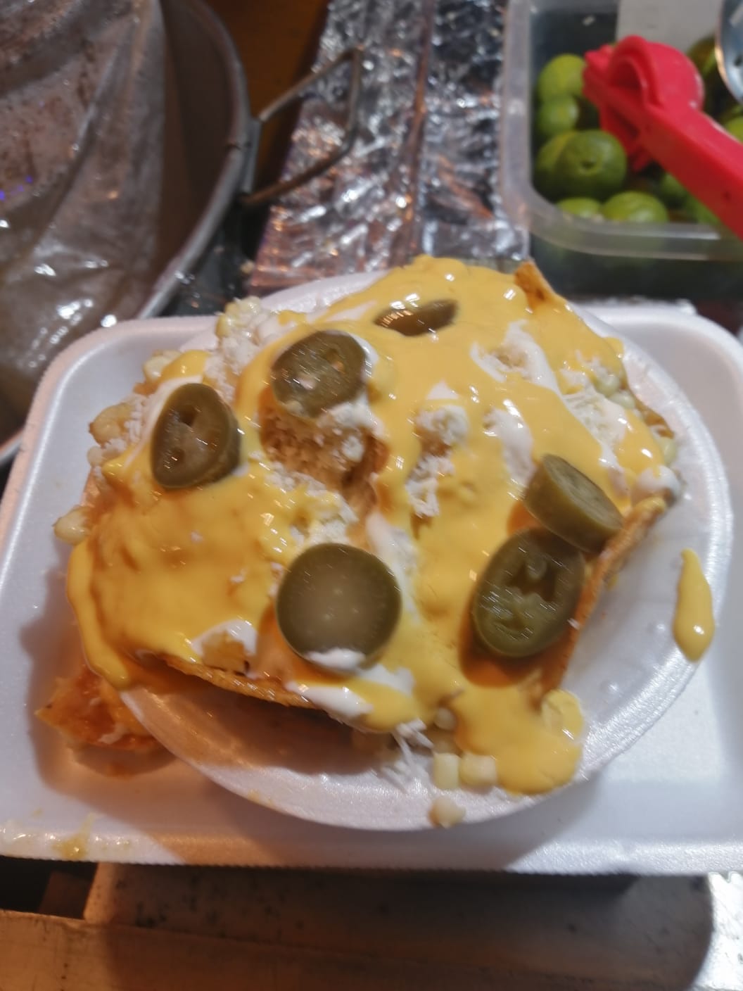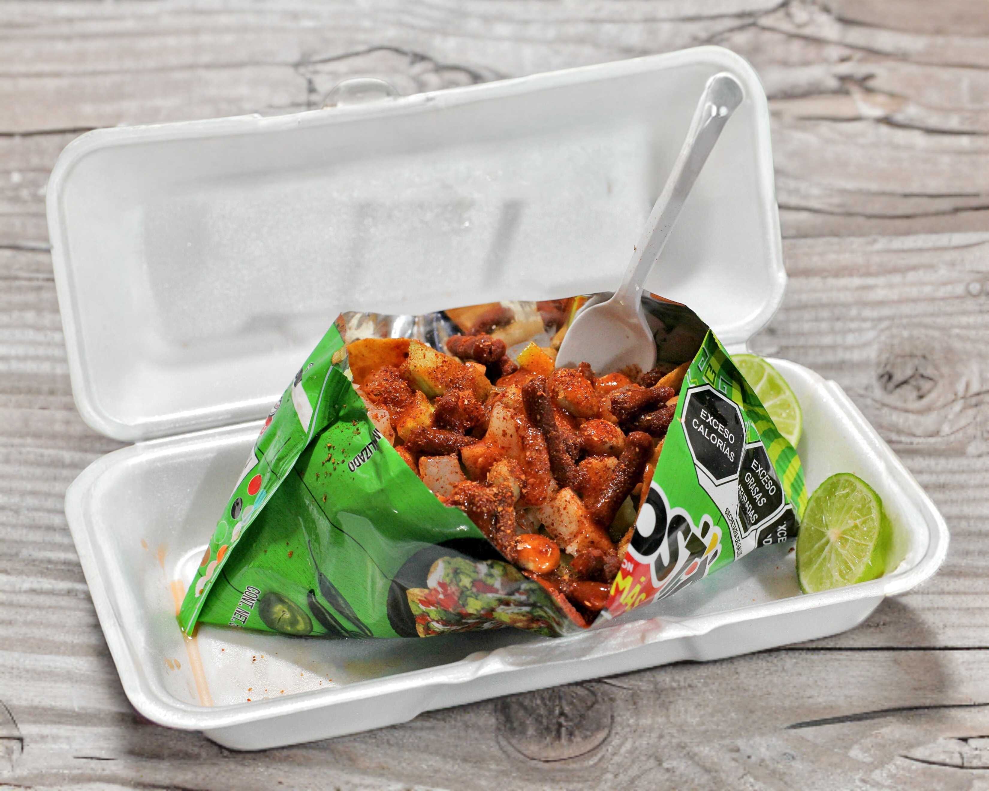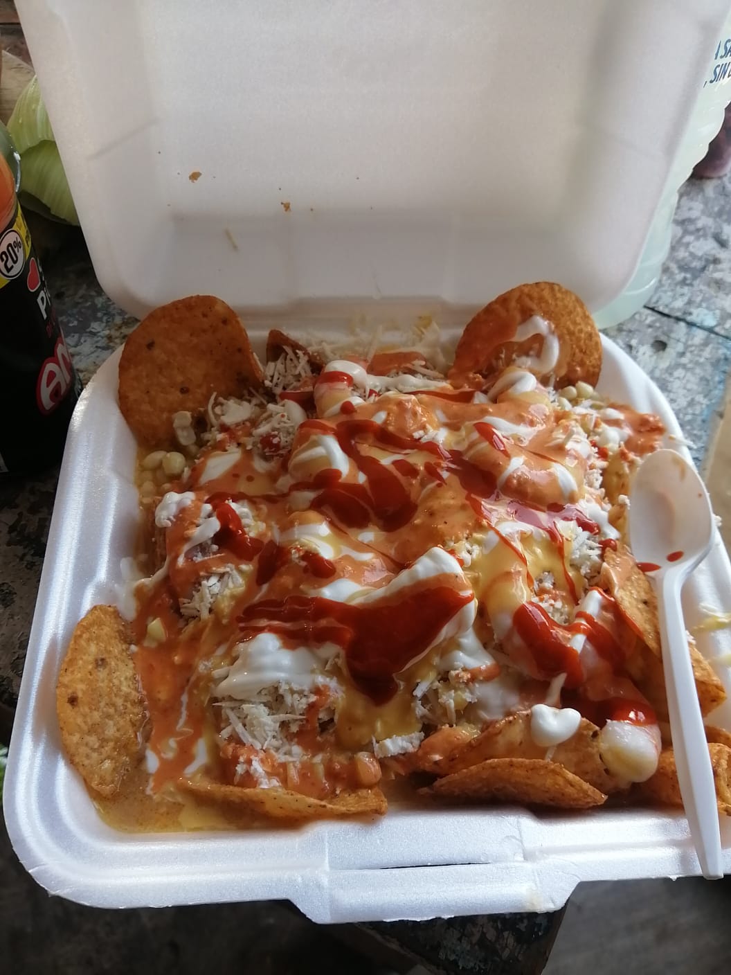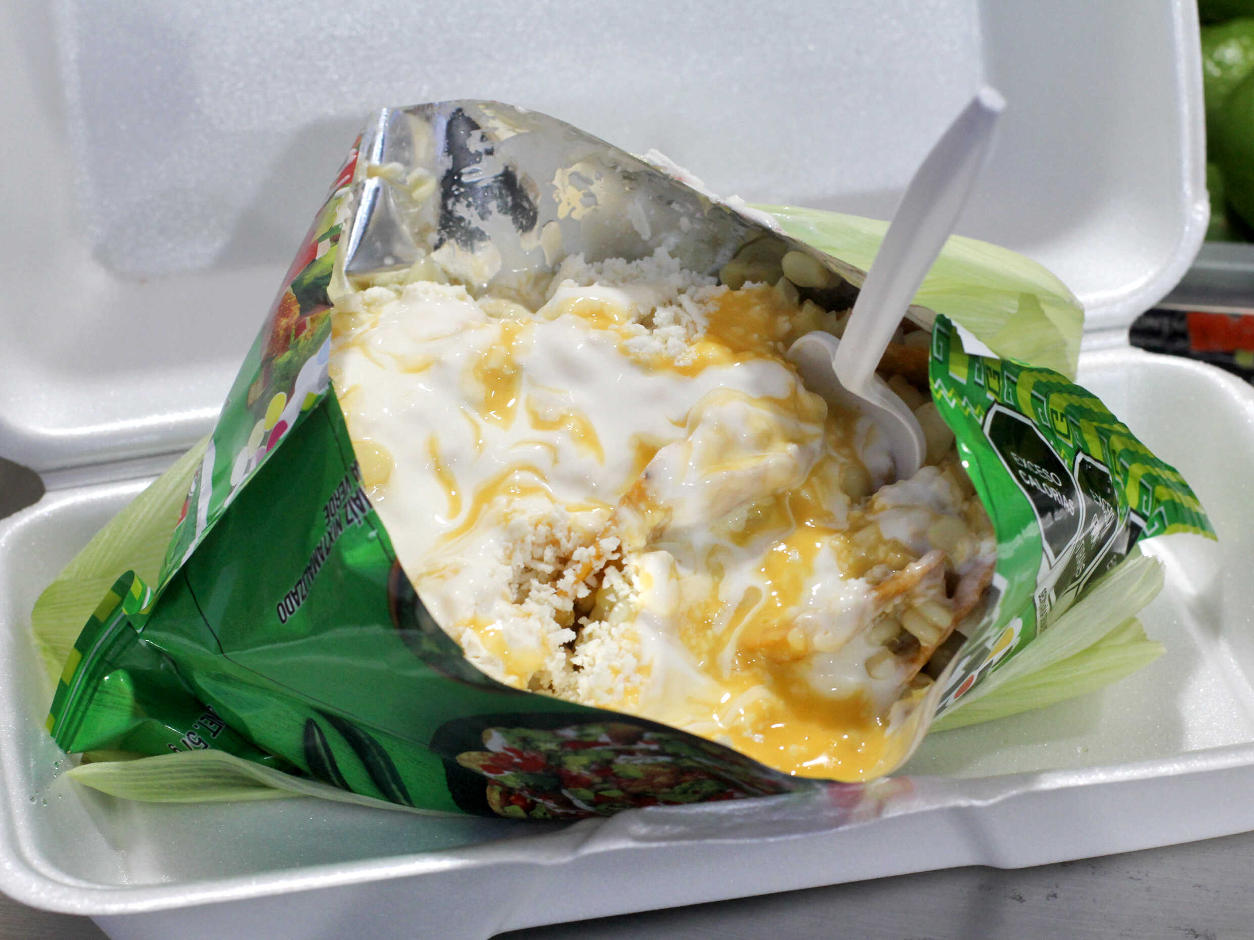 Una capa de papitas (bolsa completa) una capa de queso amarillo, elote desgranado encima un elote entero con mantequilla sal Mayonesa limón queso rallado etc