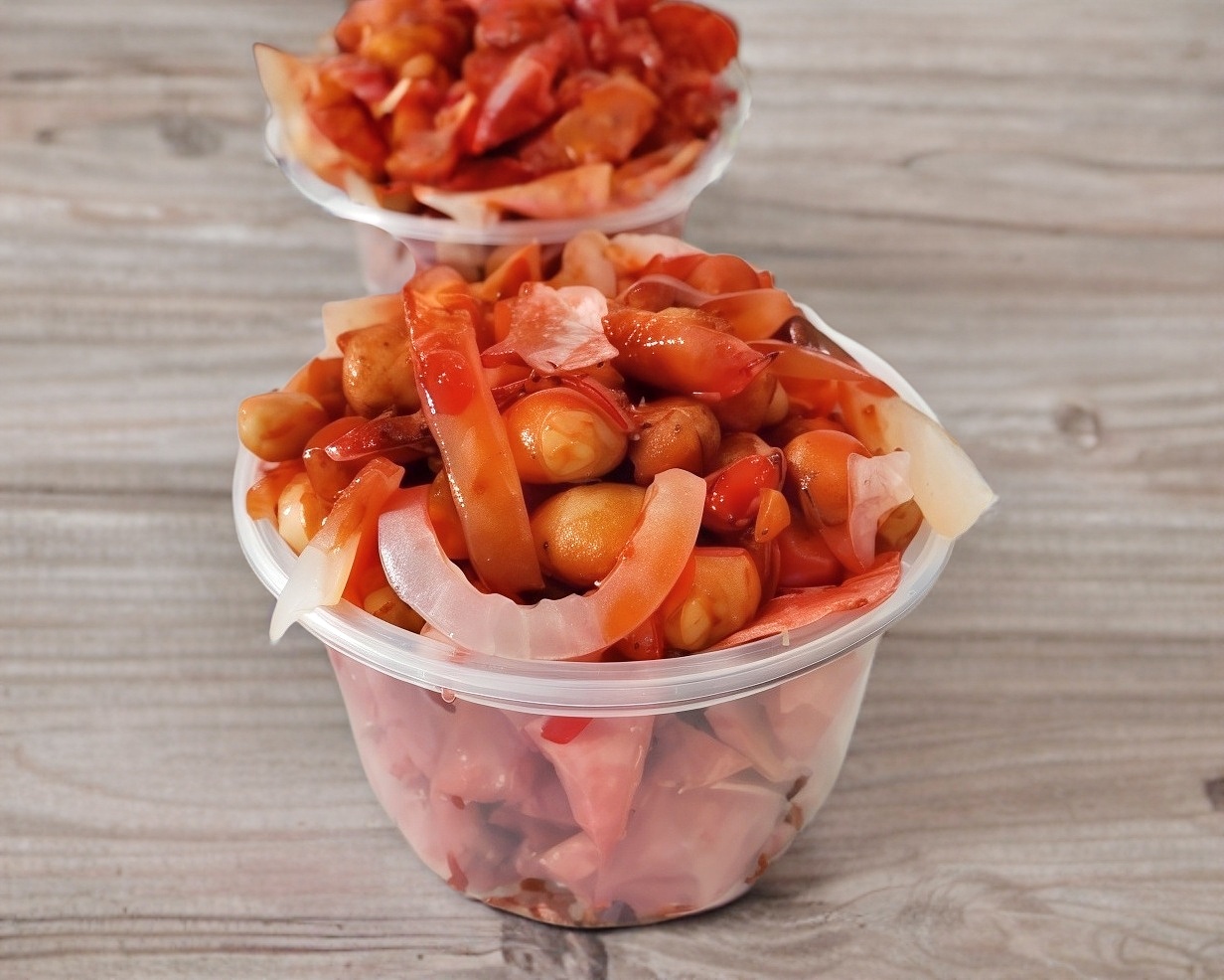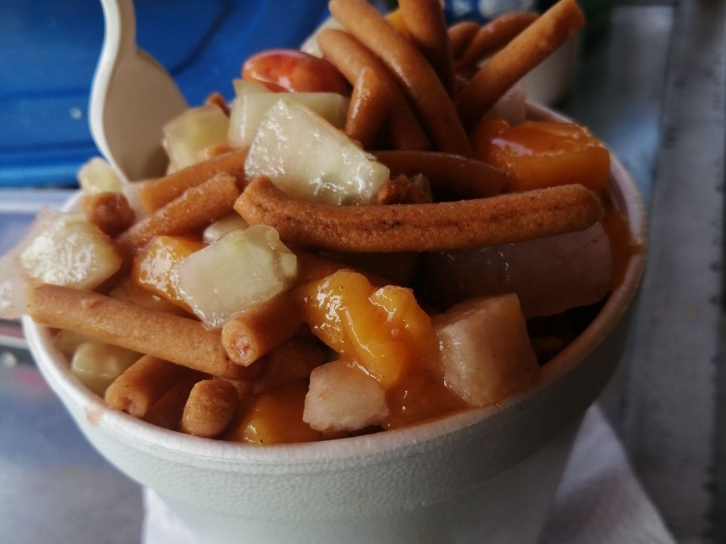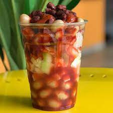 Pepino en tiras, cacahuate, cuerito, rielitos, limón, sal, Tajín, salsa, Clamato.