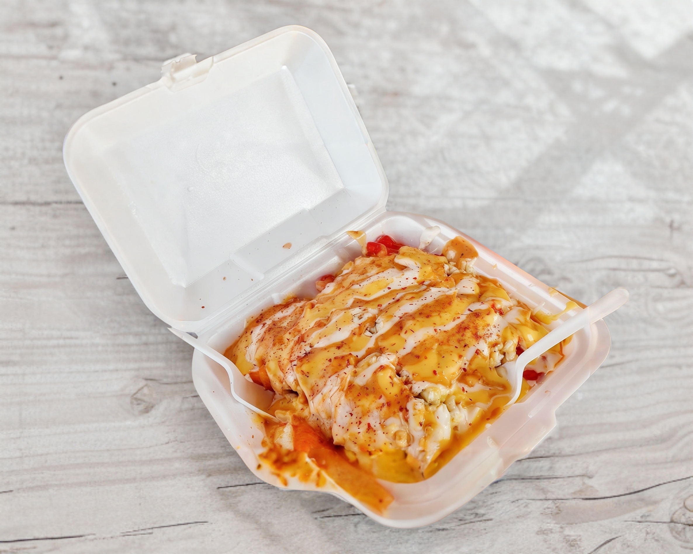 Elote entero con mayonesa mantequilla queso sal limon en un contenedor para evitar derrames (salsasapate)