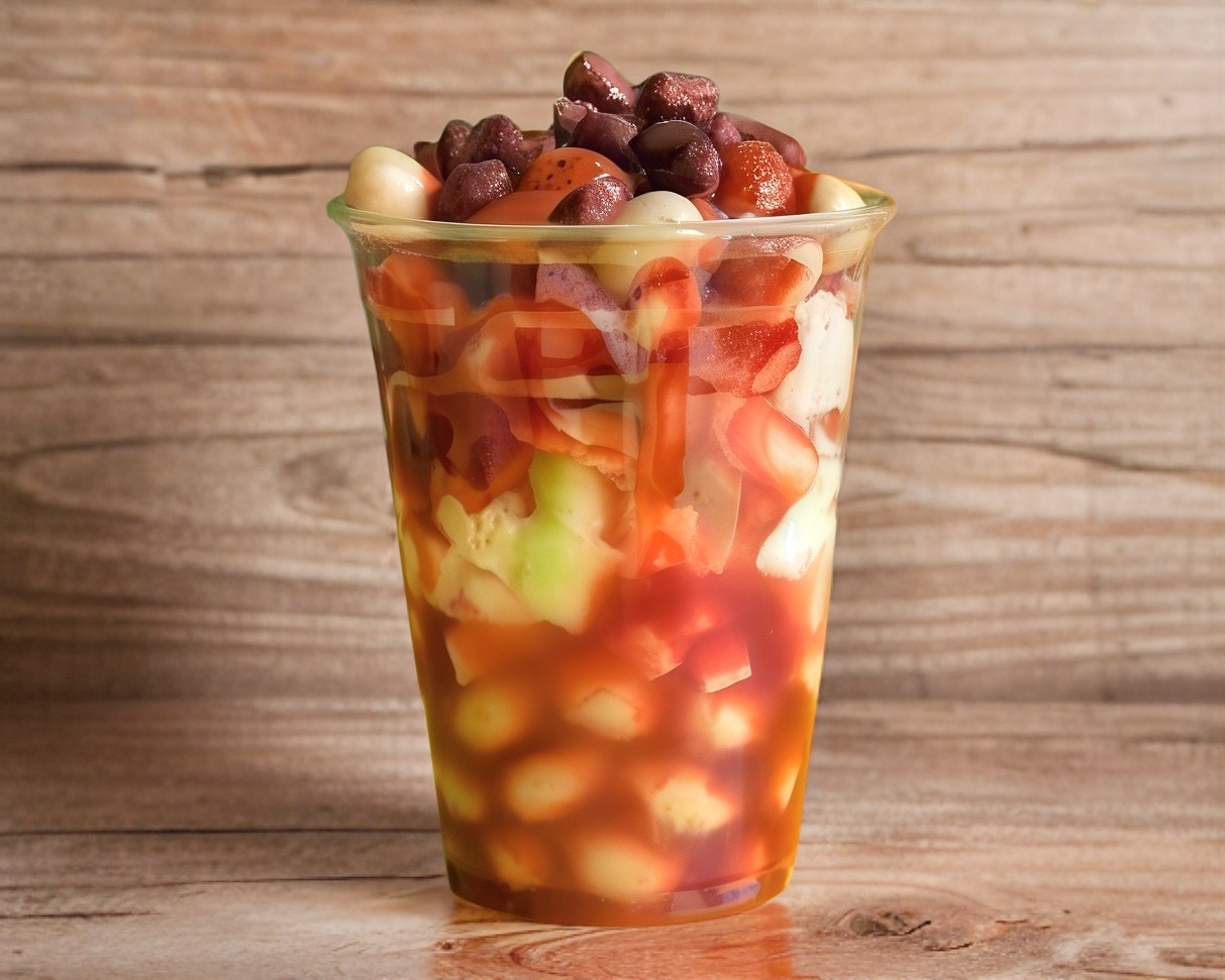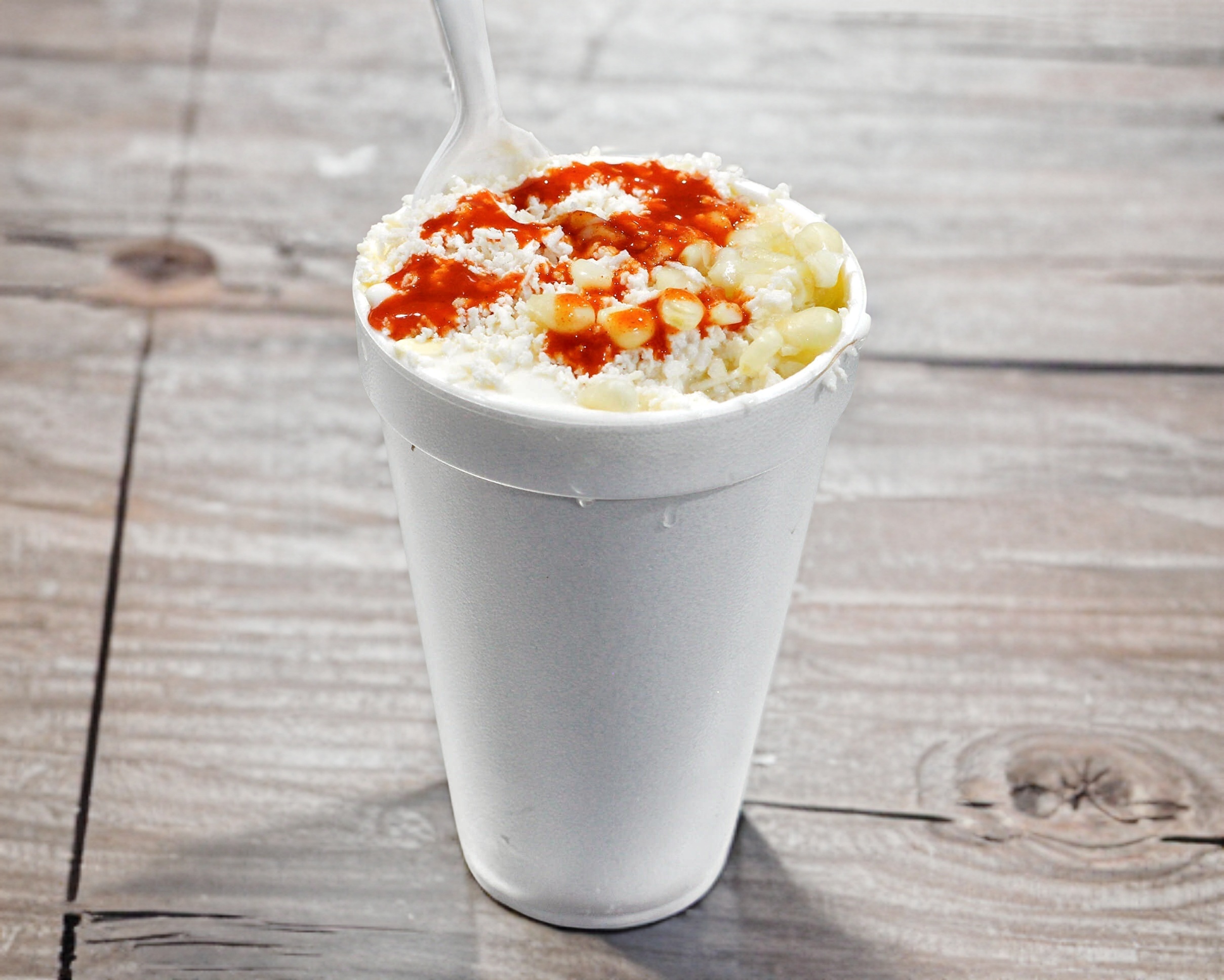 Vaso preparado con grano de elote, mantequilla, mayonesa, queso cotija, limón, salsa 10 onzas