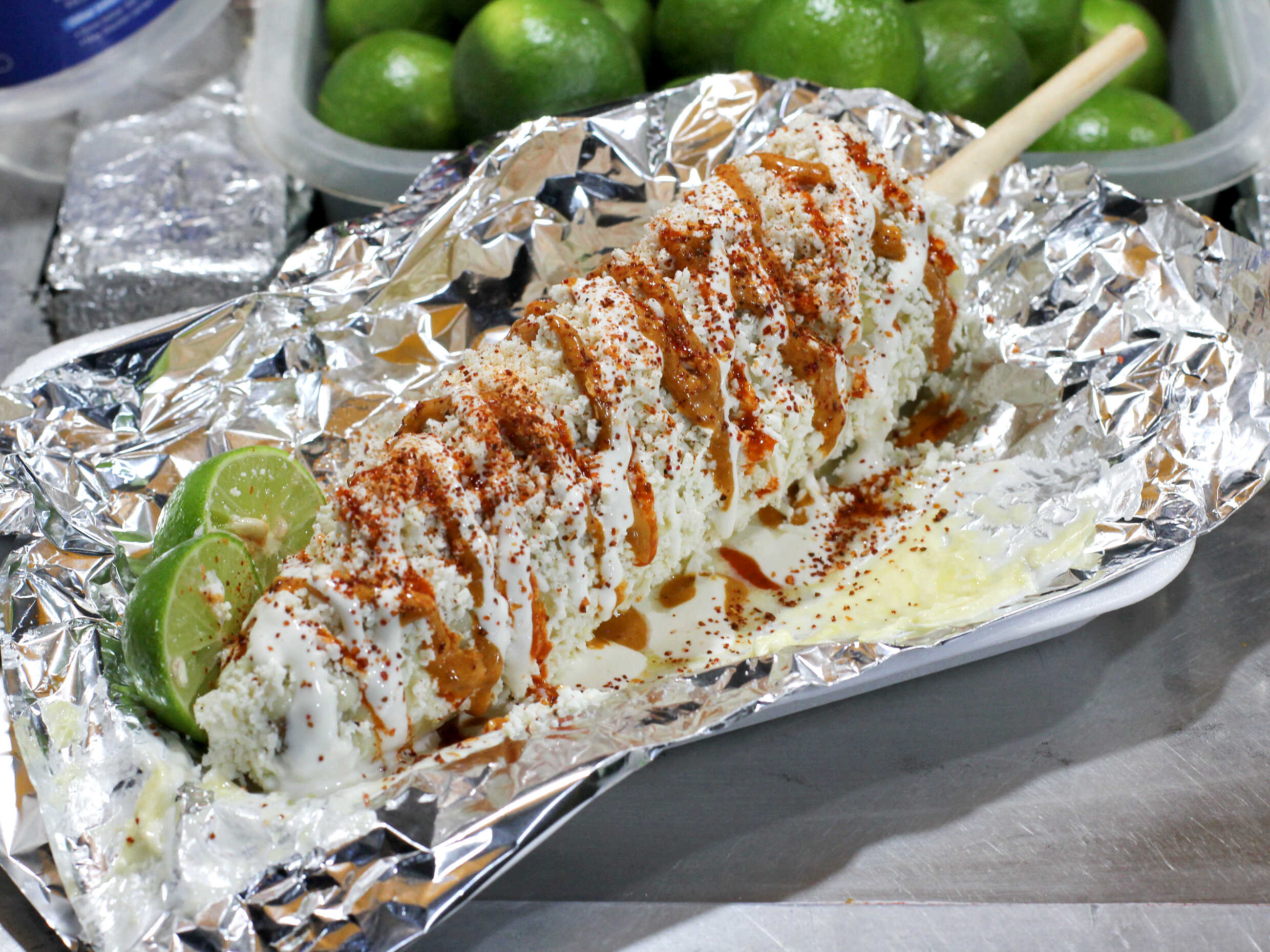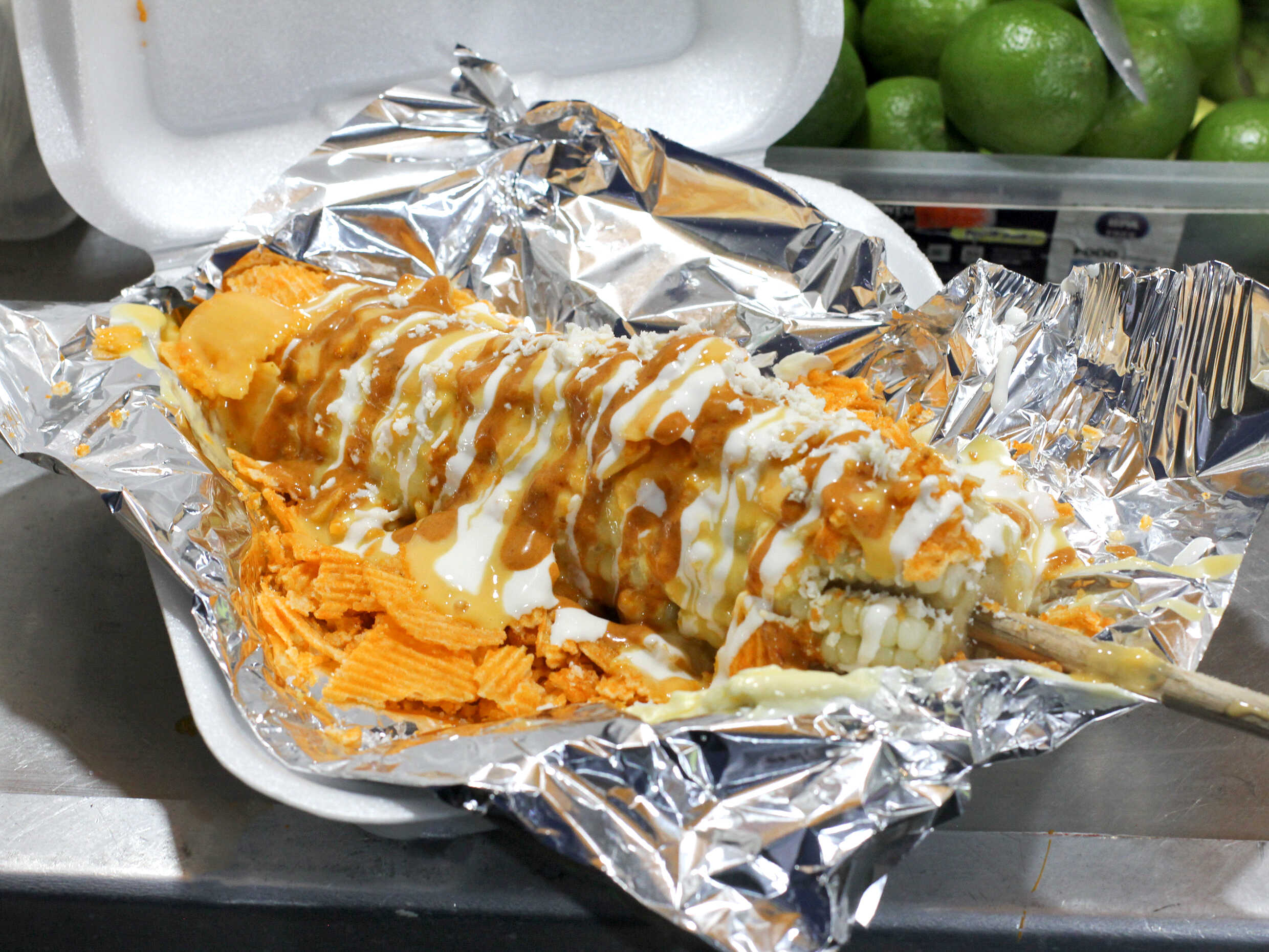 Elote mayonesa mantequilla queso sal limon queso amarillo crema papitas aparte