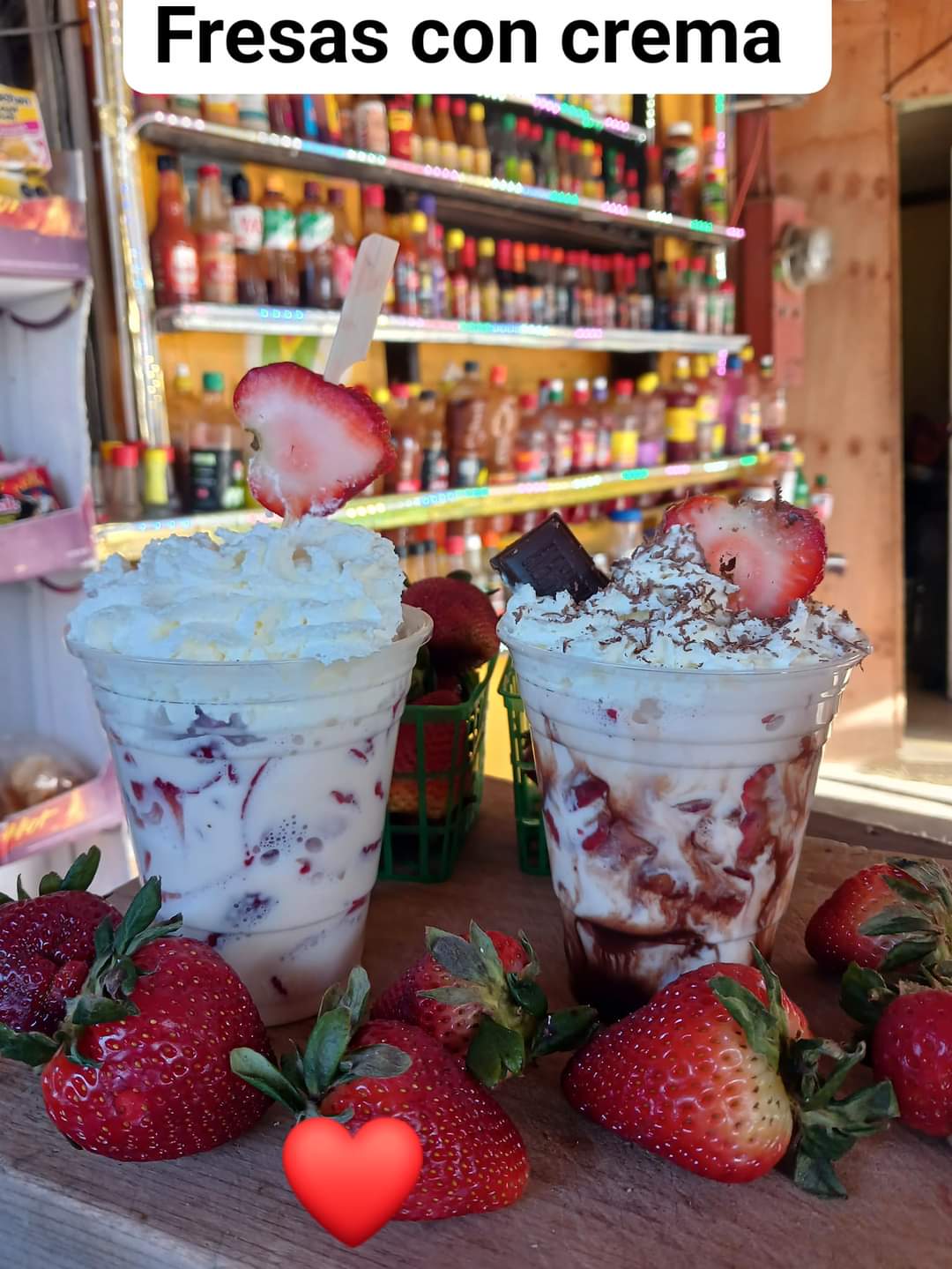 Fresa congela con crema de la casa. Crema chantilin ensima y chocolate encima