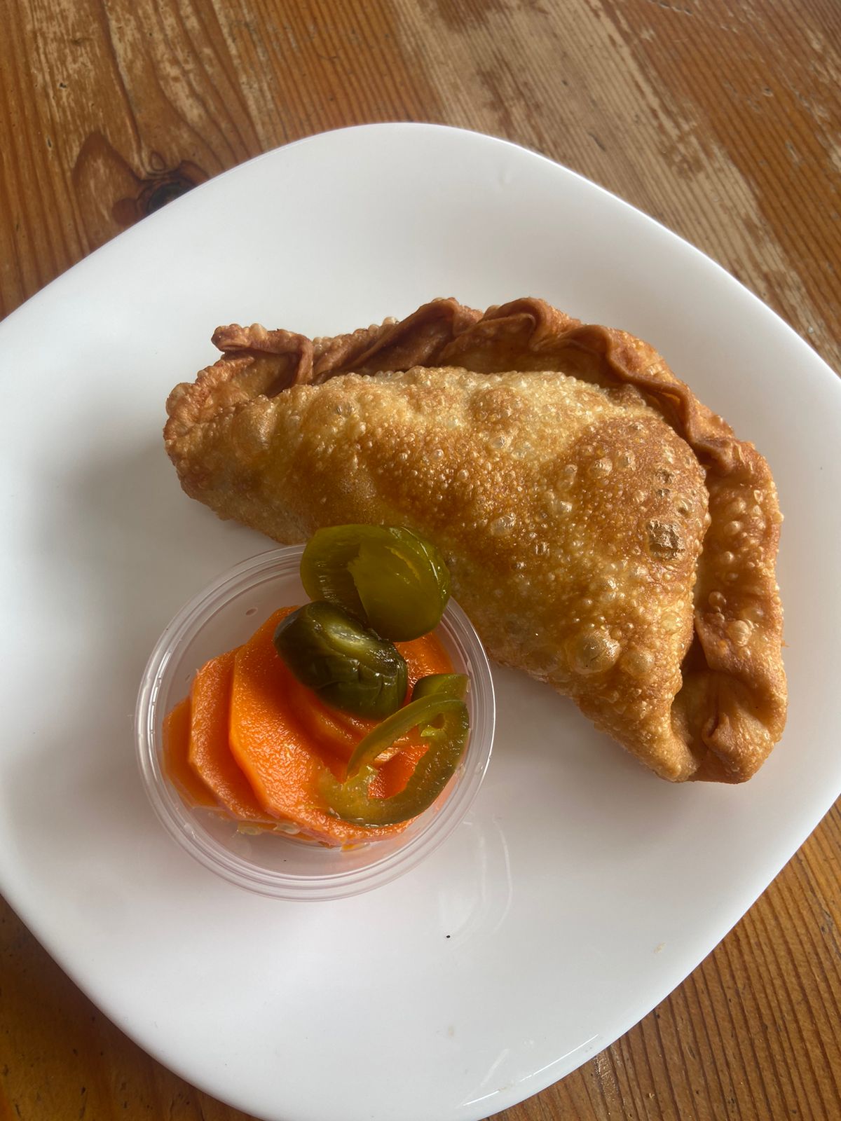 Incluye 2 empanadas de Carne acompañadas de frijoles refritos, sopa de coditos
