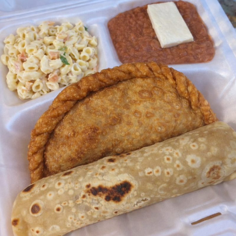 Dos empanadas a elegir compañado de sopa fria y frijol con chorizo