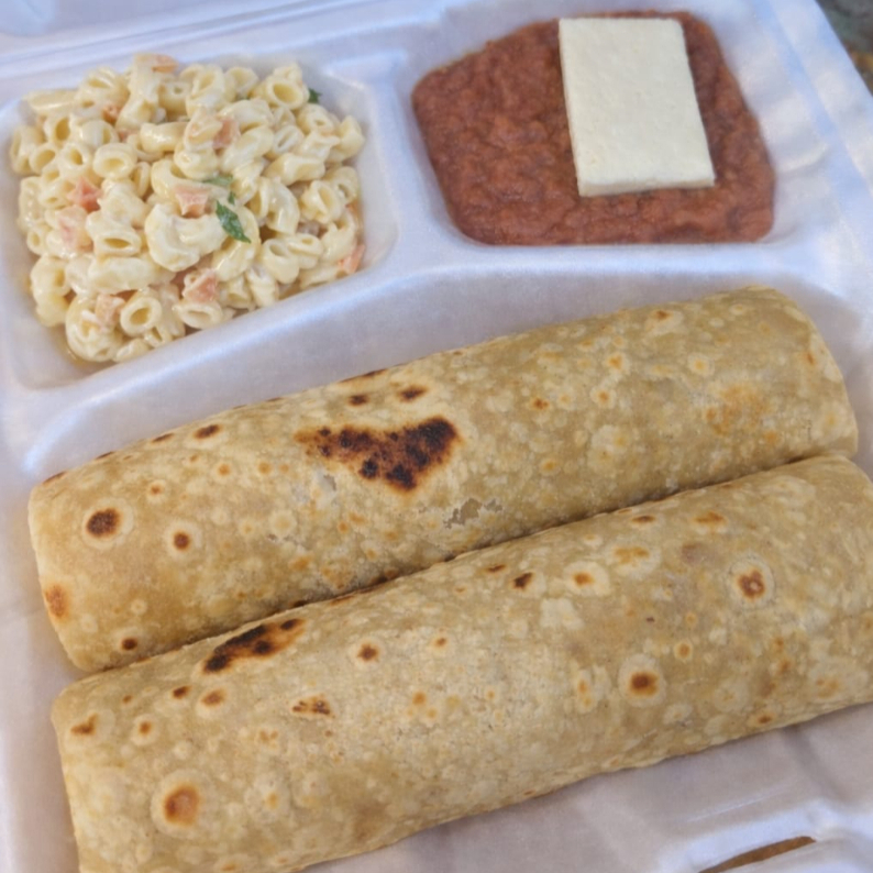 Empanada a elegir + burrito de machaca seca, acompañado de sopa fria y frijol con chorizo, y coronado de queso