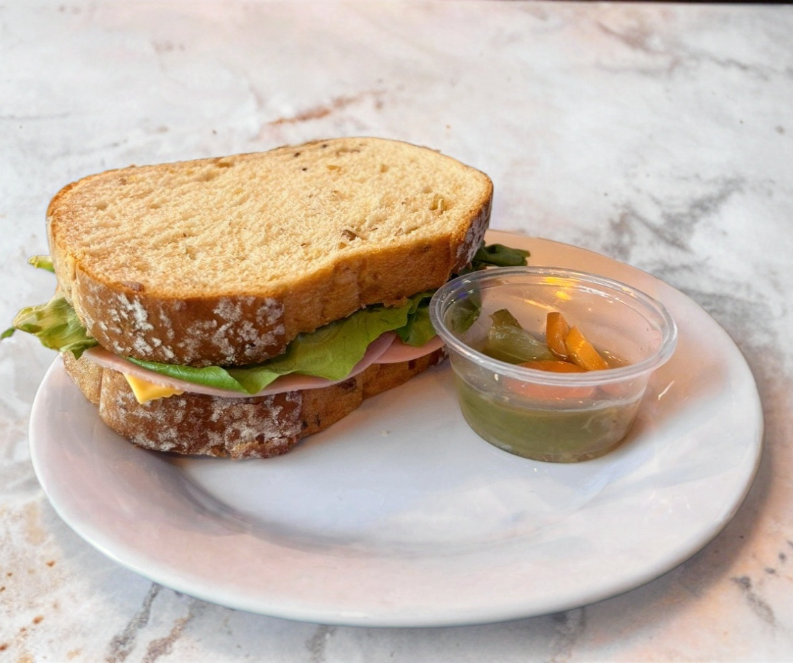 Pan multrigrano con jamón, queso amarillo, mayonesa, lechuga romana.