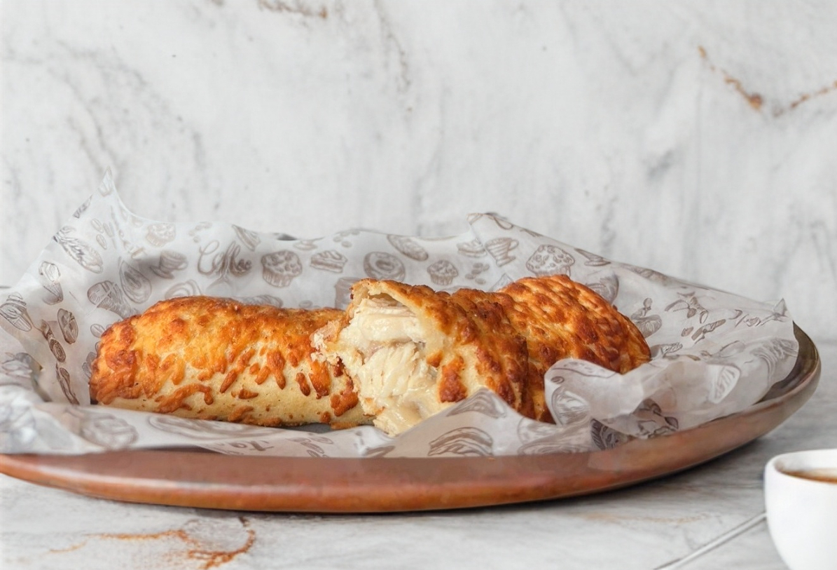 Bagel de queso con jamón y queso tipo suizo blanco, gratinado.