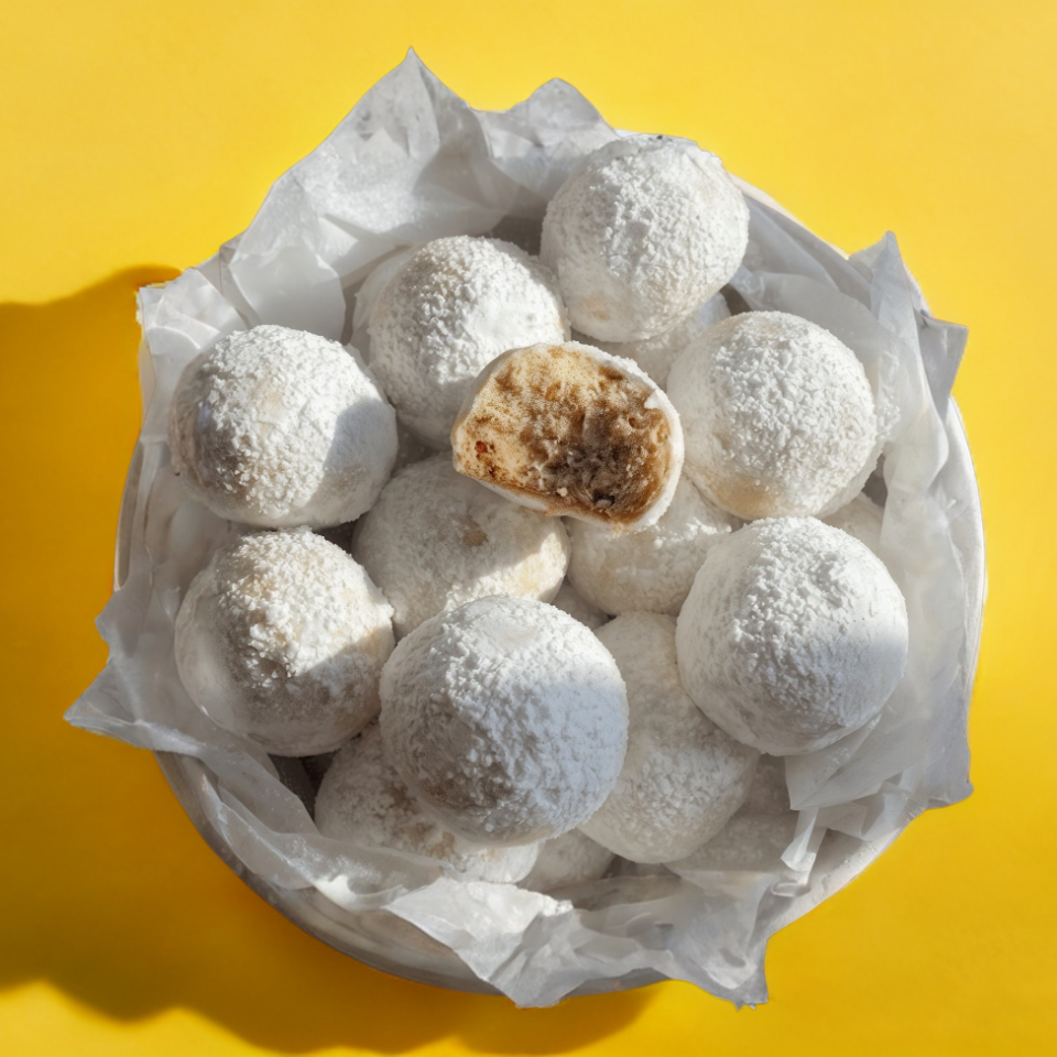 Galletita suave con trocitos de nuez espolvoreada de azúcar impalpable.