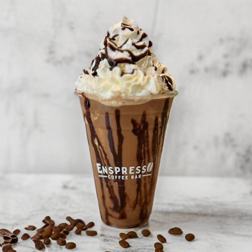 Mezcla de chocolate, leche fría y hielo, creando una textura cremosa y refrescante.