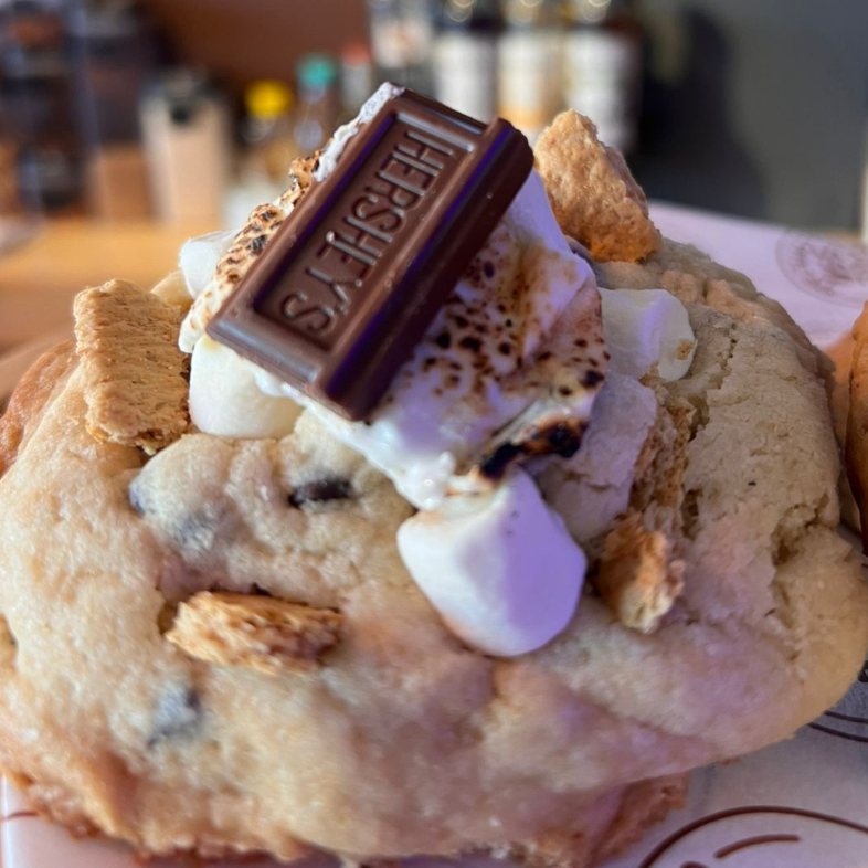 Galleta estilo Nueva York con chispas de chocolate blanco y chocolate semi obscuro con trozos de galleta graham, topping de chocolate hersheys y bombones tostados.