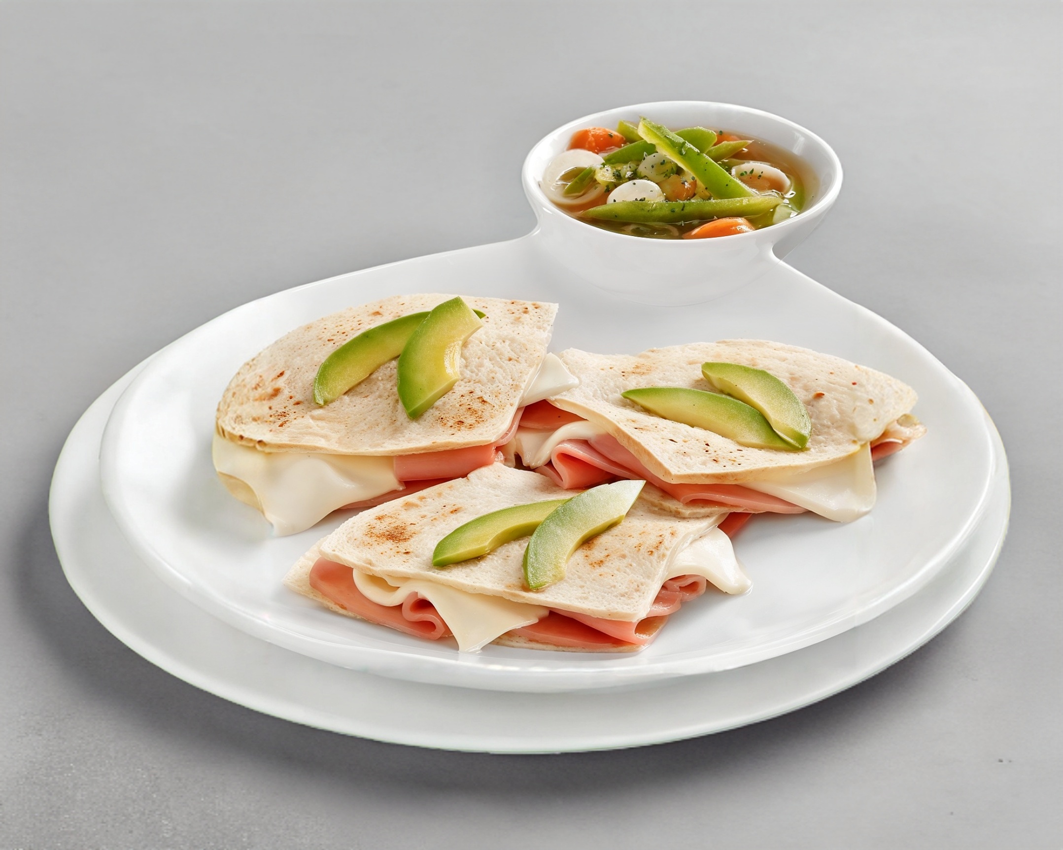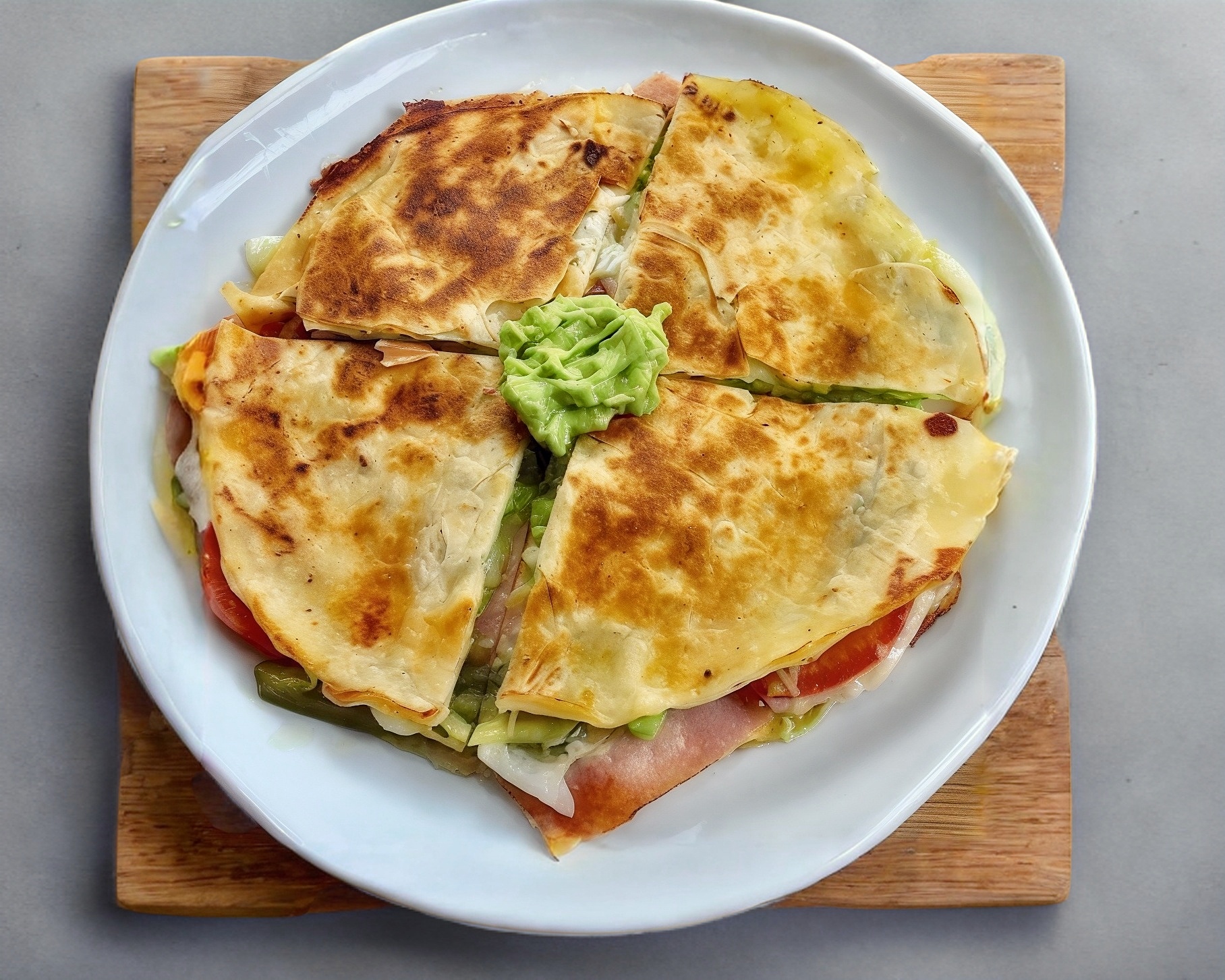 2 tortillas de harina, queso, jamon, tomate, lechuga y aguacate. incluye chiles jalapeños