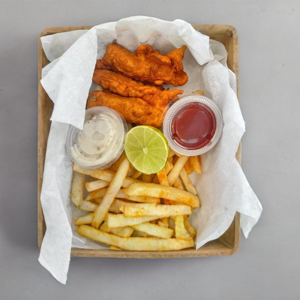 Papas sazonadas, tiras de pescado acompañadas de salsa tártara y catsup.