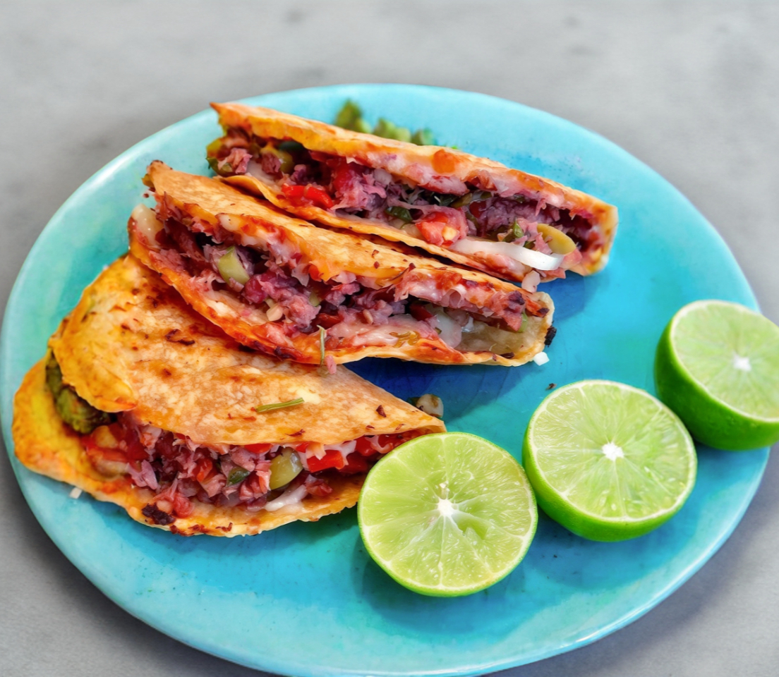 Tortilla de maíz, queso y machaca de marlin.
