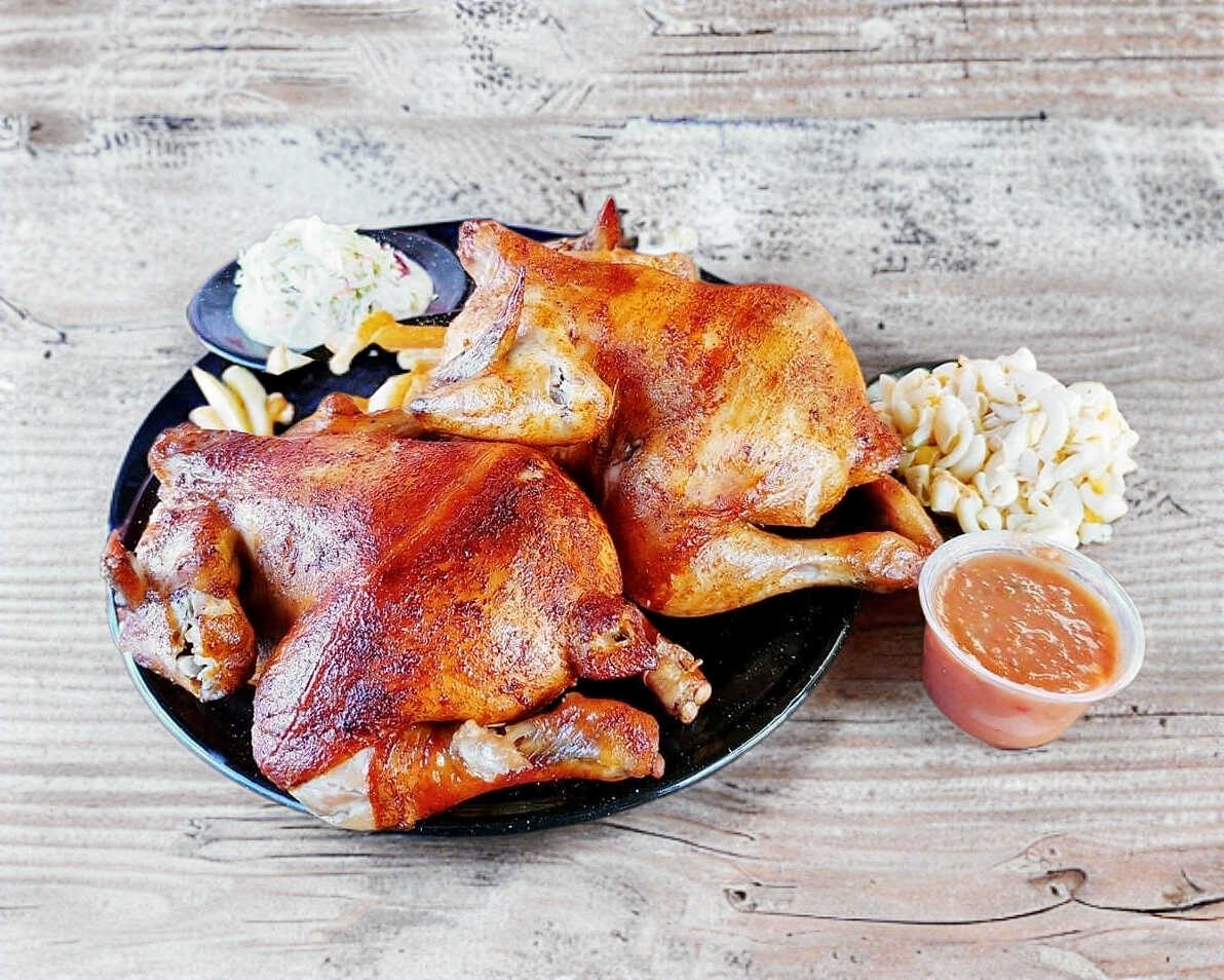 2 Pollos rostizados acompañados de una orden de papas fritas, tortillas, salsa, totopos, ensalada de pasta y ensalada de repollo.