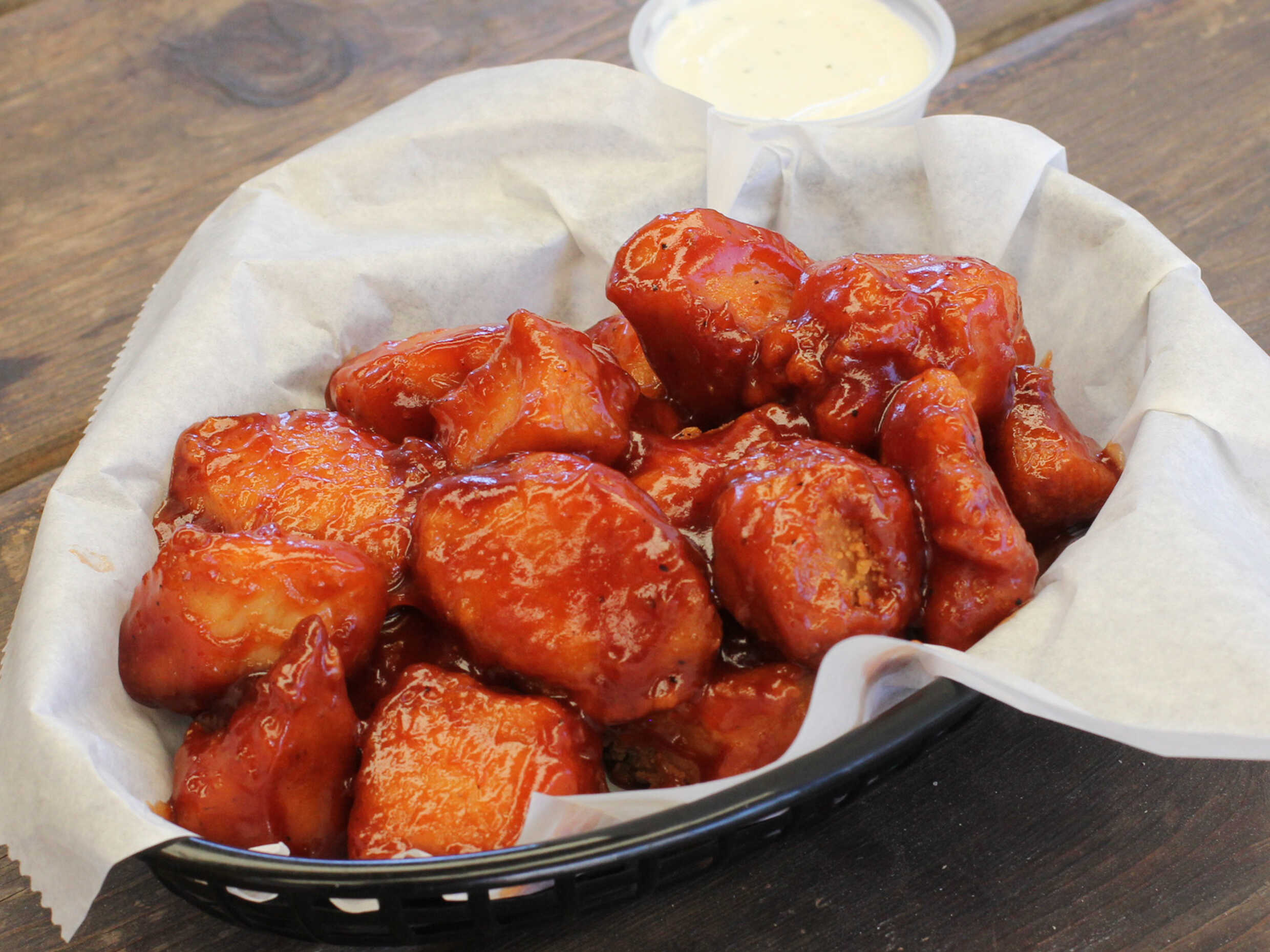 Tortilla de harina con espinaca, boneless con tu salsa favorita, papas fritas, pasta con queso, guacamole y aderezo ranch.