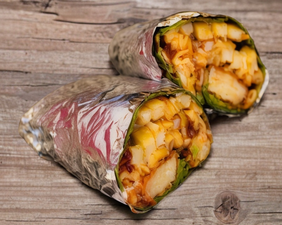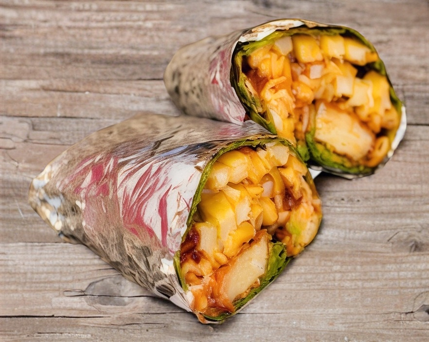 Tortilla de harina con espinaca, costilla ahumada, con tu salsa favorita, papas fritas, pasta con queso, guacamole y aderezo ranch.