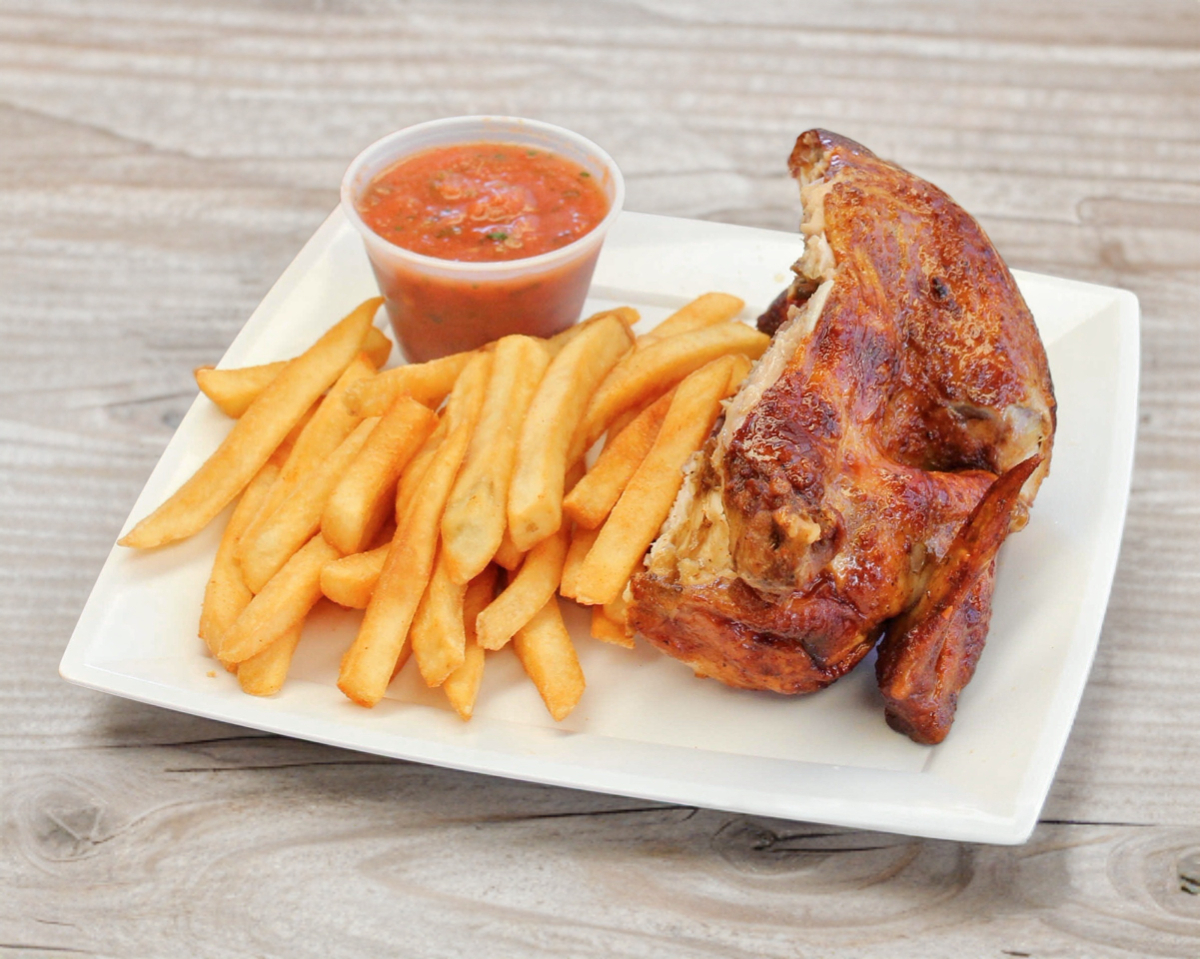 Medio pollo rostizado acompañado de tortillas, media orden de papas, salsa y una bebida.