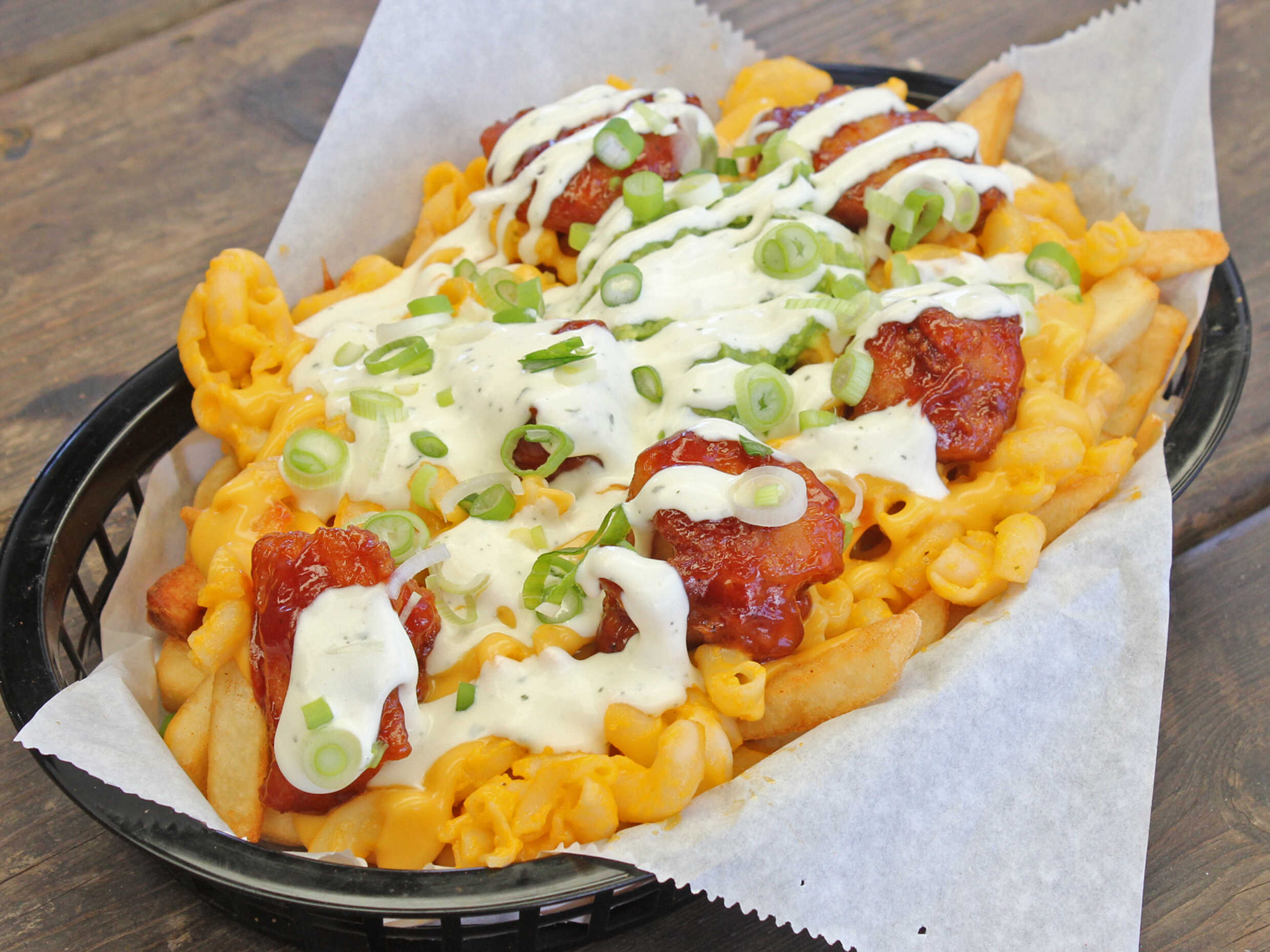 Orden de papas fritas con queso cheddar, boneless, pasta con queso, guacamole, cebollín y aderezos de la casa.