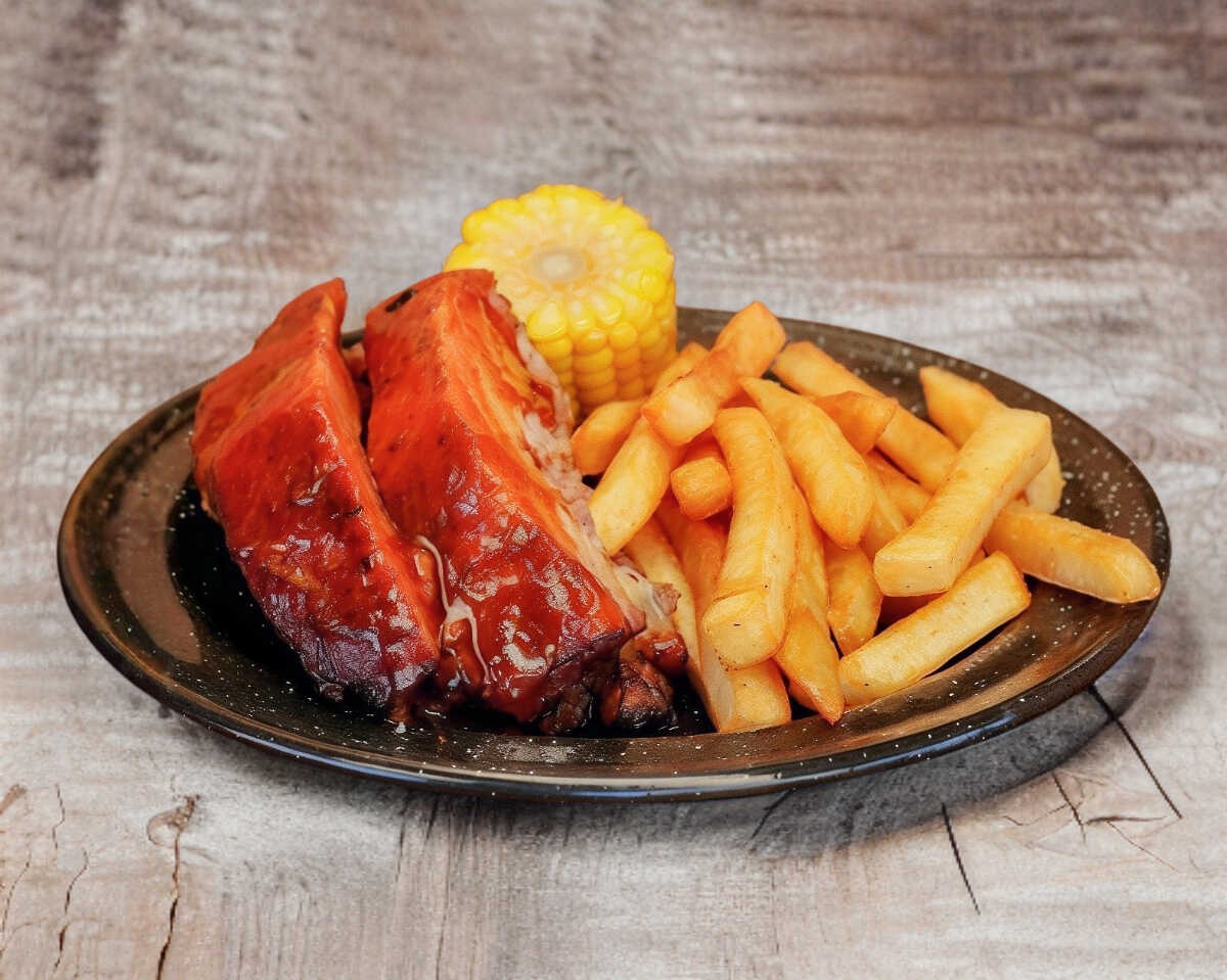 2 Piezas de costilla de puerco ahumadas, bañadas en salsa BBQ, acompañadas de media orden de papas fritas y una porción de elote.