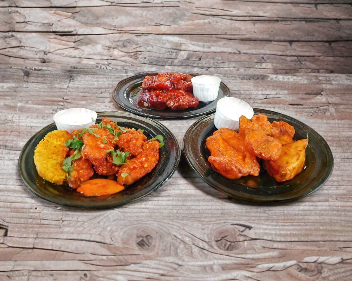 12 Piezas de costilla de puerco ahumada, bañadas en salsa BBQ, alitas 16 piezas con tu salsa favorita, acompañadas de una orden de papas fritas, ensalada de repollo y 3 porciones de elote.