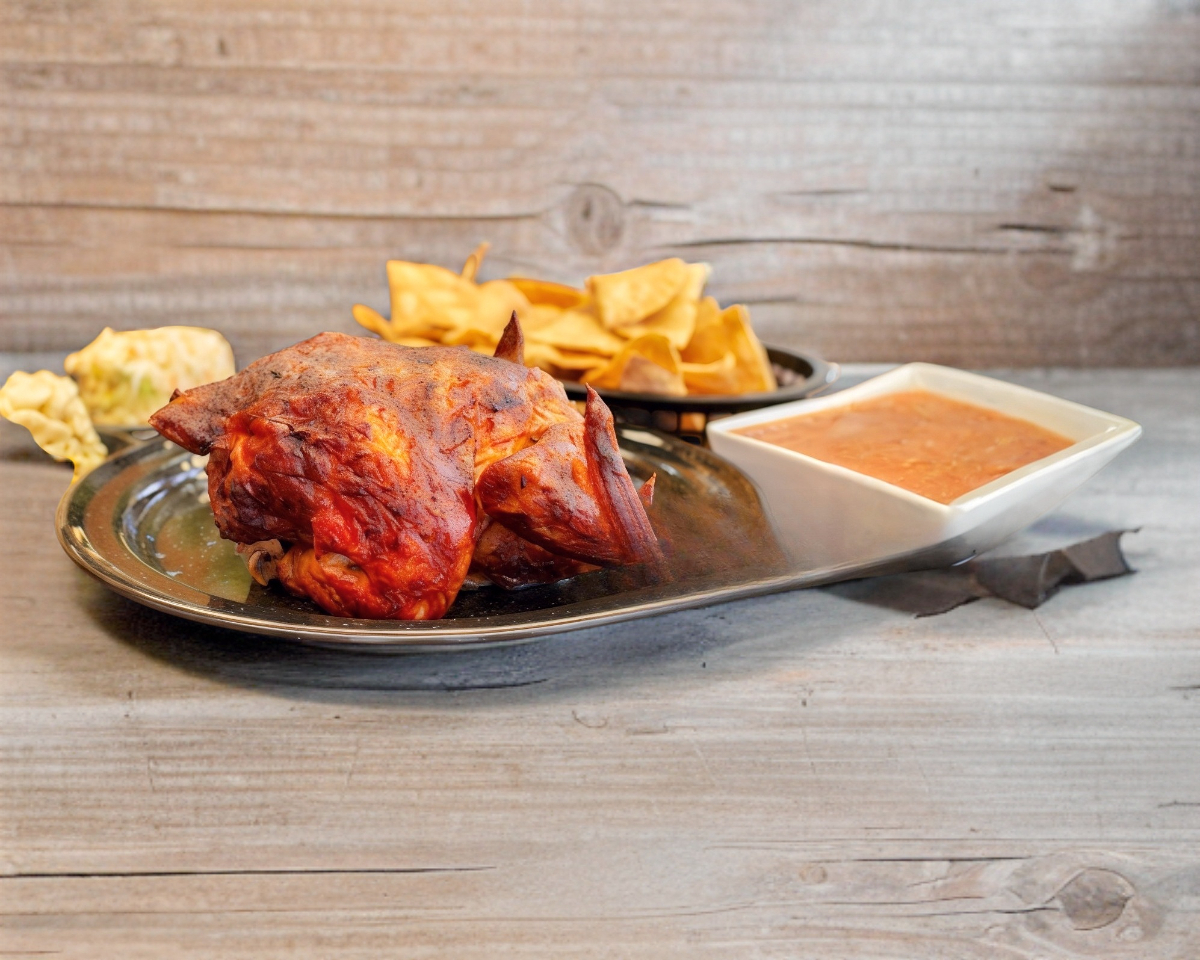 Medio pollo rostizado acompañado de tortillas y salsa.