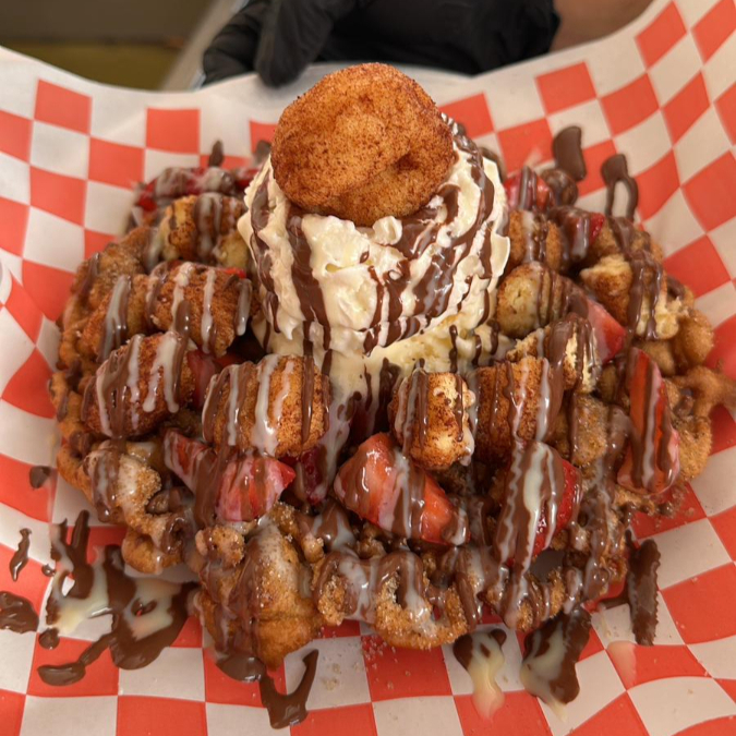 Funnel cake sabor churro, con glaseado clásico, fresa, nieve de vainilla, crema batida, donitas y lecherita