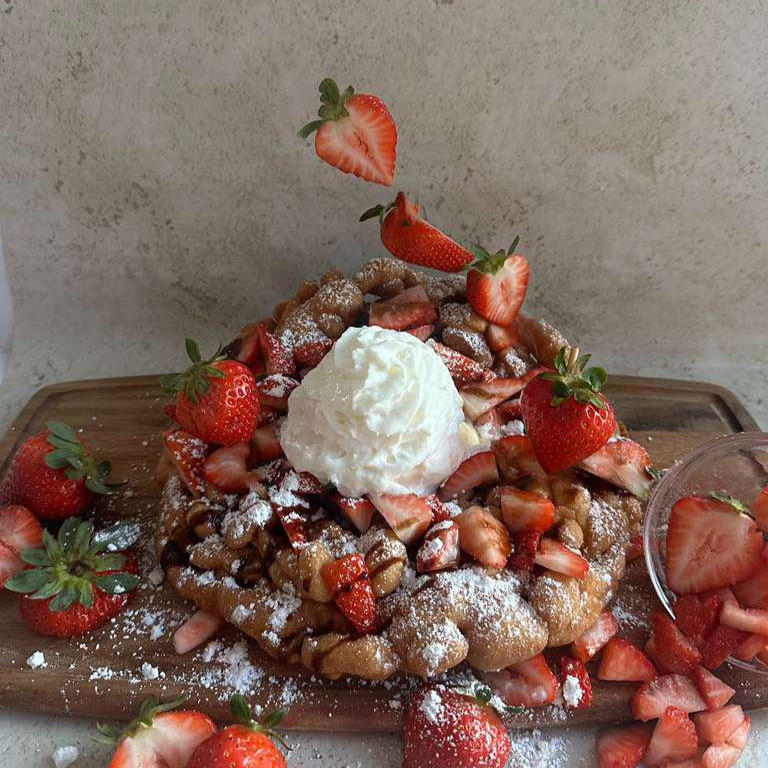 Funnel cake con azúcar glass, fresa, nieve de vainilla, crema batida y endulzante de fresa